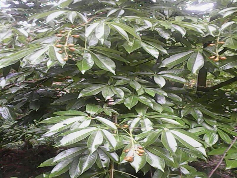 七叶树树形冠如华盖,高可达25米。它的树皮是灰褐色的,树枝粗壮,树叶像手掌一样,一个叶柄上长有七片叶子,所以叫它七叶树,又叫桫椤树。