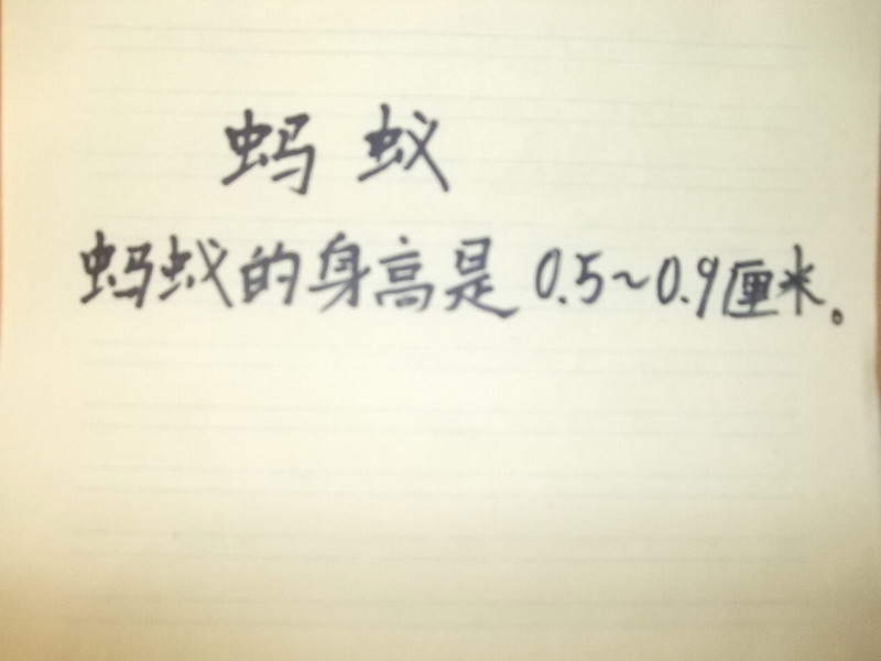 我继续在地上寻找下一个蚂蚁居民。找到之后,我开始认真地量。可这只蚂蚁是个倔脾气,宁死不屈。弄得我满头大汗,还没有量出来。我冲它大吼:"你安静点,我帮你量身高!"无论我怎么样,它都充耳不闻唯一想做的就是挣脱我的束搏。无奈,我找来了面包渣,这才量出身高。我一早上就自言自语地对着蚂蚁。我总共量了十只蚂蚁,最后自豪的得出结论:蚂蚁的身高在0.5到0.9厘米。