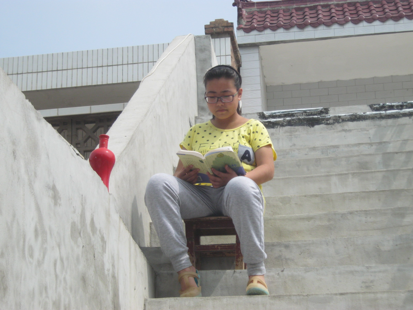 我喜欢拿着一个小板凳,和一本心爱的书,坐在楼梯中央的台阶上。在和谐美丽的大自然中,遨游在书的海洋里,感受着文字的魅力。