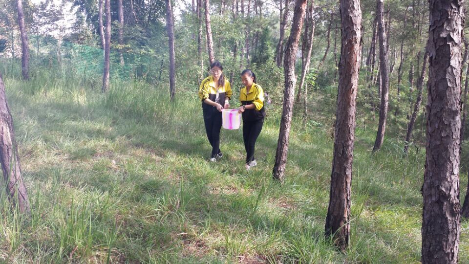 在路上,同学们欢声笑语,你一言我一语,高高兴兴地走着。大约走了半小时,我们终于来到了目的地——学校后山松树林。