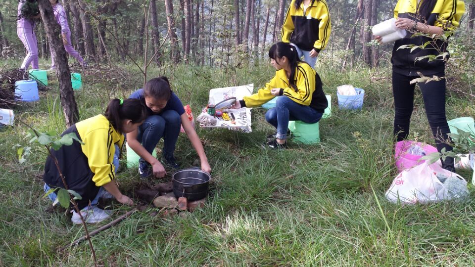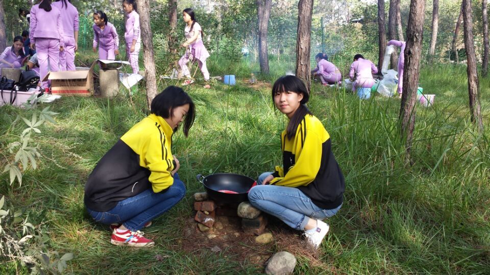 到达目的地,虽然同学们满头大汗,但是谁都没有说累。接着同学们便忙了起来。同学们有的搭灶、有的打水、还有的洗菜、切菜、炒菜,忙的不可开交。