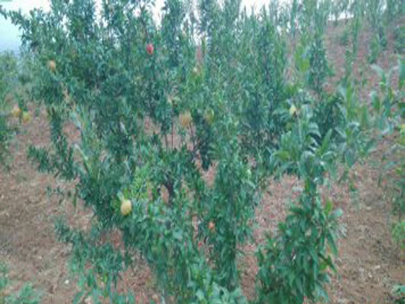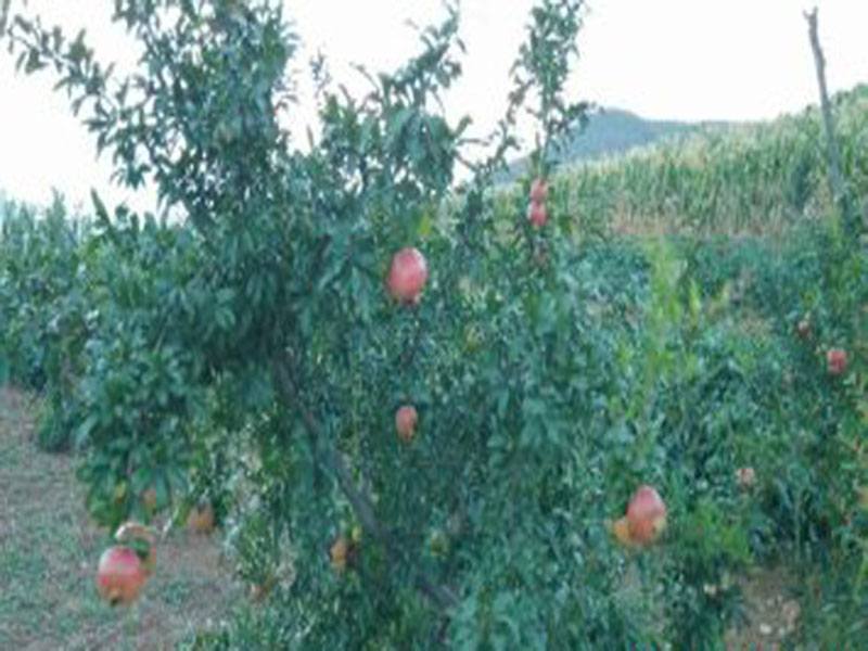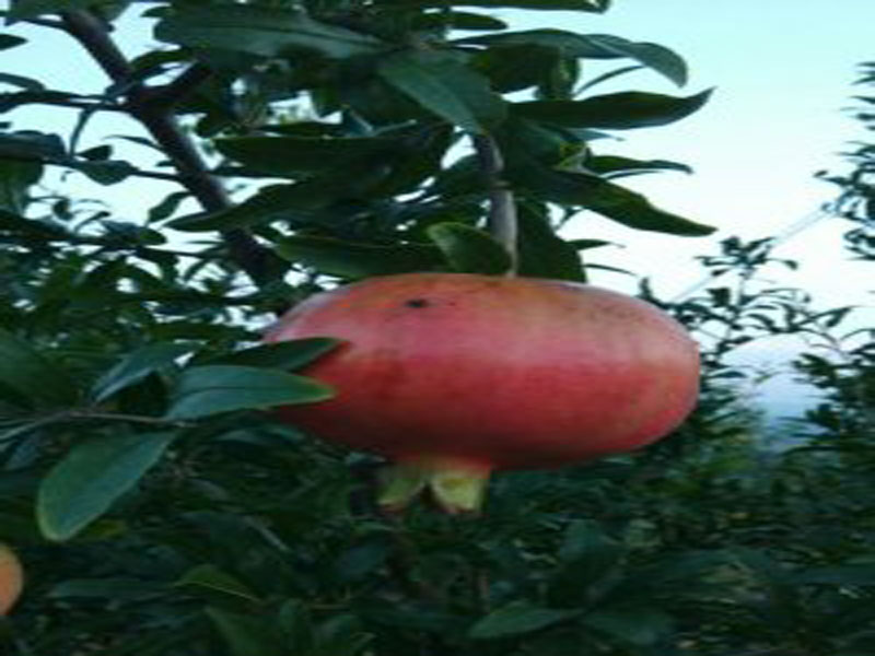 石榴刚接出的果实是小小的、青色的、如果你掰开你会发现石榴没有果粒;随着时间的变换石榴会渐渐地青变红的,就如现在一样看起来像一个红红的苹果。石榴的上面有一个椭圆形的东西,看去像是一朵王冠又像是一多调零的花朵又或者像是一个装饰品。