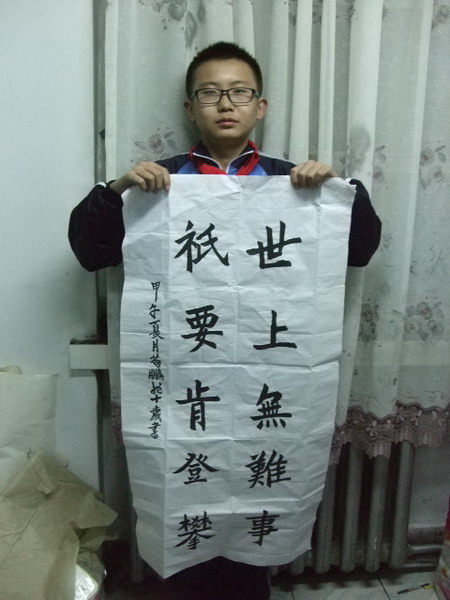 现在,别看他做起事来慢慢悠悠的,但是却写得一手好毛笔字。但凡学校里有什么特长之类的活动,我都会看到他那伟岸的身影在勤奋的努力着。就像那一次在六一儿童节里,每个班都要出节目。我们当时是有我们自己编排的羽泉组合的《奔跑》唱歌配舞蹈,总共有十几个同学。我和苟鹏飞也参与其中,我们俩是在现场写毛笔字,最后并展示。可是不知道是怎么回事,可能是紧张怯场,写得又慢又难看。苟鹏飞与我的差别简直是天壤之别。