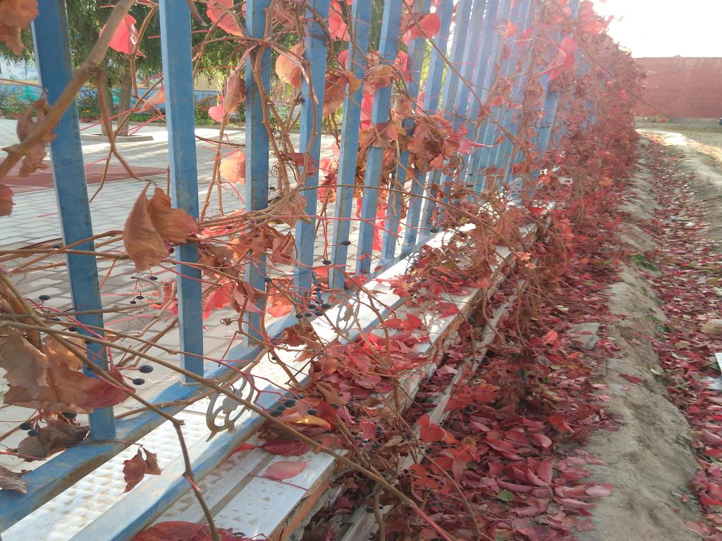 入冬了,天气也变冷了,霜降也悄悄地来了。被霜冻了的叶子又变成了另一副模样。爬山虎的叶子又变成了深红色了,但仍旧是密密麻麻的,一片挨着一片。密不透风的红色爬山虎变成了我们校园冬天最美的风景。