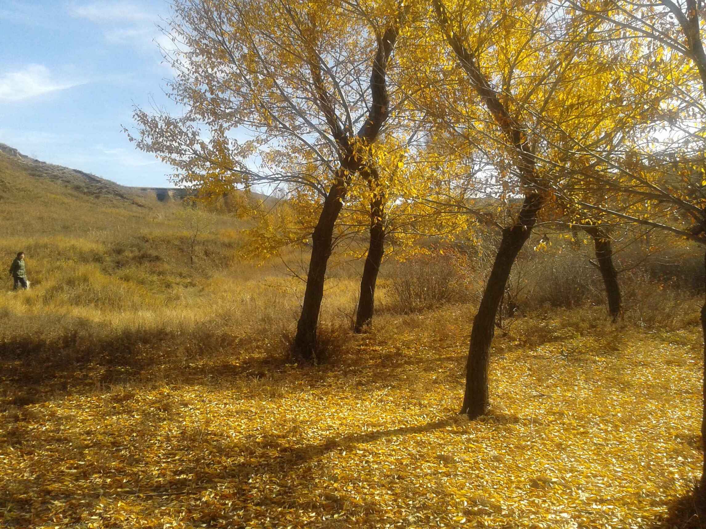 家乡的不远处有一个荒草地,那里有树还有荒草和野花,平时也没怎么注意它有多好看。深秋的一个中午,我来到了那里,原来那里的秋天那么美,美得让人惊艳。草还是那片草,树还是那棵树,唯一不同的是它的颜色转成了耀眼的金色。