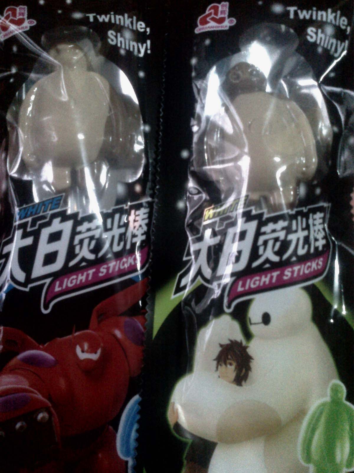 大白荧光糖造型很奇特,像个小人。它的手柄是一根塑料棍,里面装着液体,最神奇的是它能在在夜里放光,就像夜明珠一样。吃了这种糖,把手柄收集起来,是一根根会发光的荧光棒。白天在太阳下晒足了,晚上就能发很久的光。