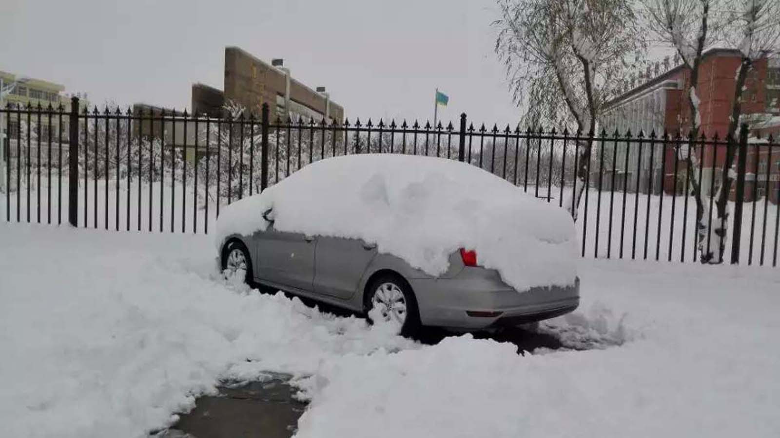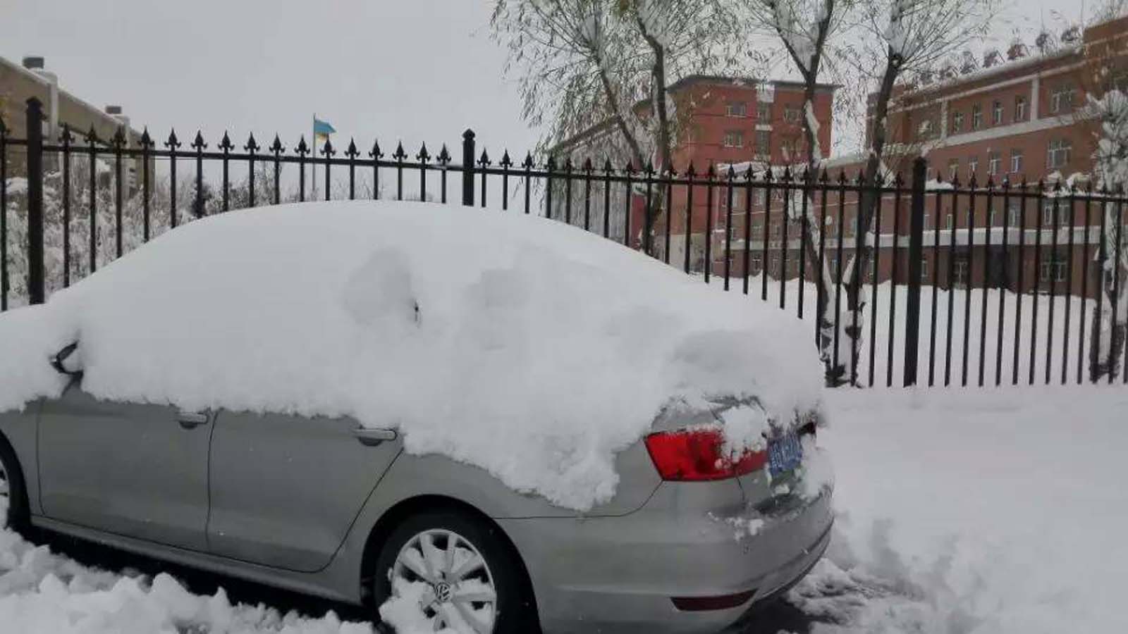 早晨推开房门,一片白茫茫的世界,大地上除了白,好像什么颜色也看不到了。就连广场上停着的汽车也成了白色,车顶上积着厚厚的雪,连车窗和车门都让雪覆盖了,只留下四个发黑的轱辘。汽车就像一个洁白的蓬松大面包一样卧在雪地里。