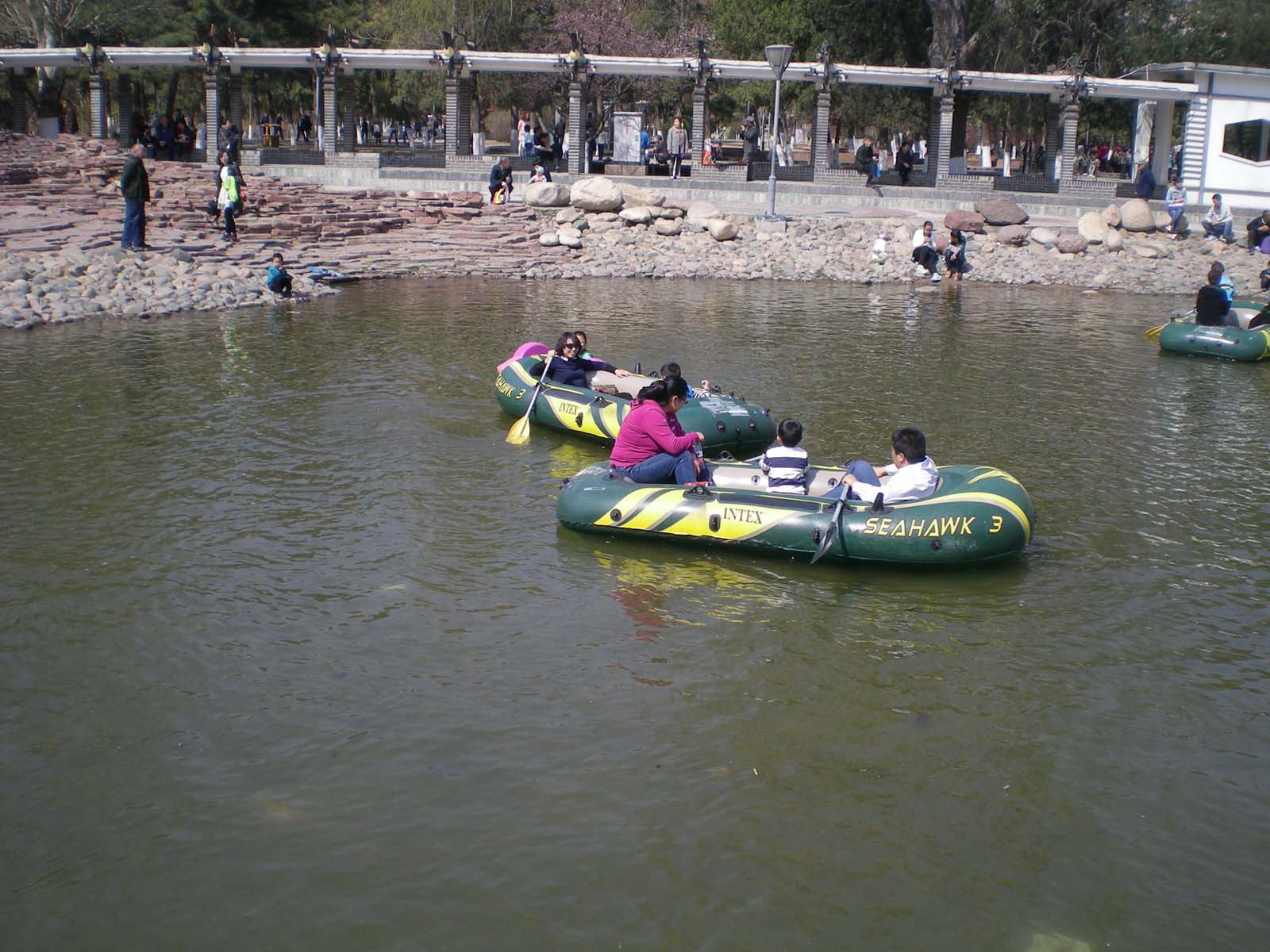 小朋友最爱玩儿的当然是水了,在池塘边就有好多的小孩子在玩水。他们有的在打水枪,有的在用网捞蝌蚪,还有的小孩干脆跑到水里戏水。水不深,浅绿色,水塘的中央有好几条船,船边还有鸭子不时的游过。