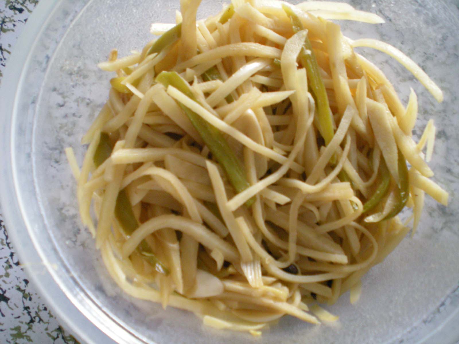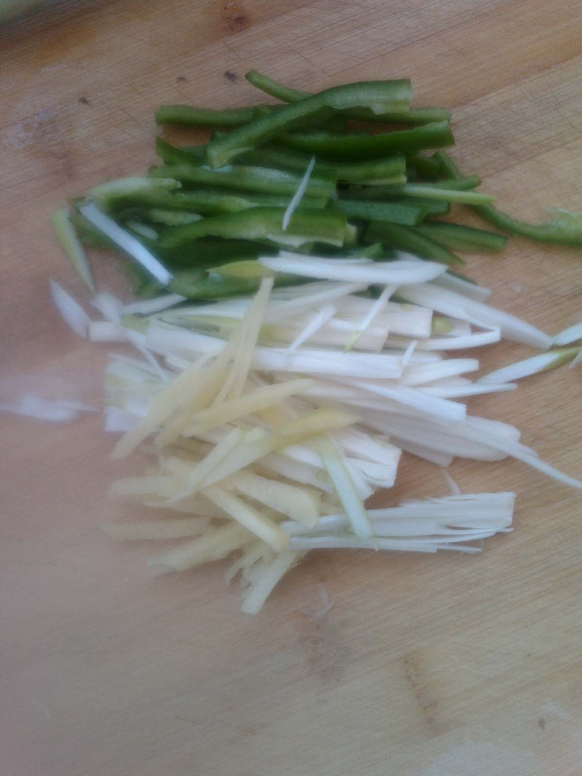 在泡山药丝的过程中,切葱、姜、蒜和肉。然后把山药丝用开水煮一下,注意不能煮太烂了。最后就是炒了,先放油,烧热后放肉和葱等。最后把山药丝倒进去,稍翻炒几下就行了。