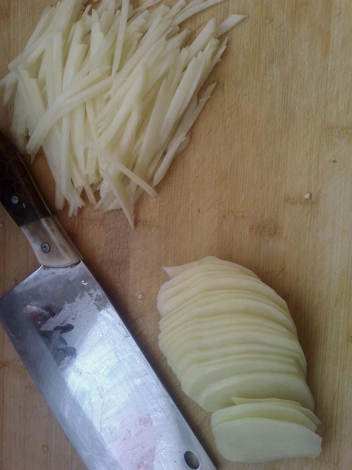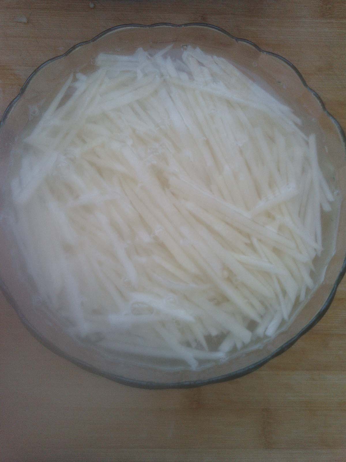 做这道菜用的材料不多,就是山药、葱、姜、蒜。先把山药削皮,然后切成丝,妈妈说这可难了,一不留神就能切了手,所以不让做。切的丝要粗细一致,这样每根山药丝都能一块熟。切好后先泡水,能去掉山药粉,这样炒出的山药丝才爽口。