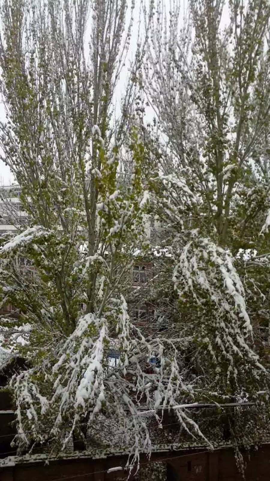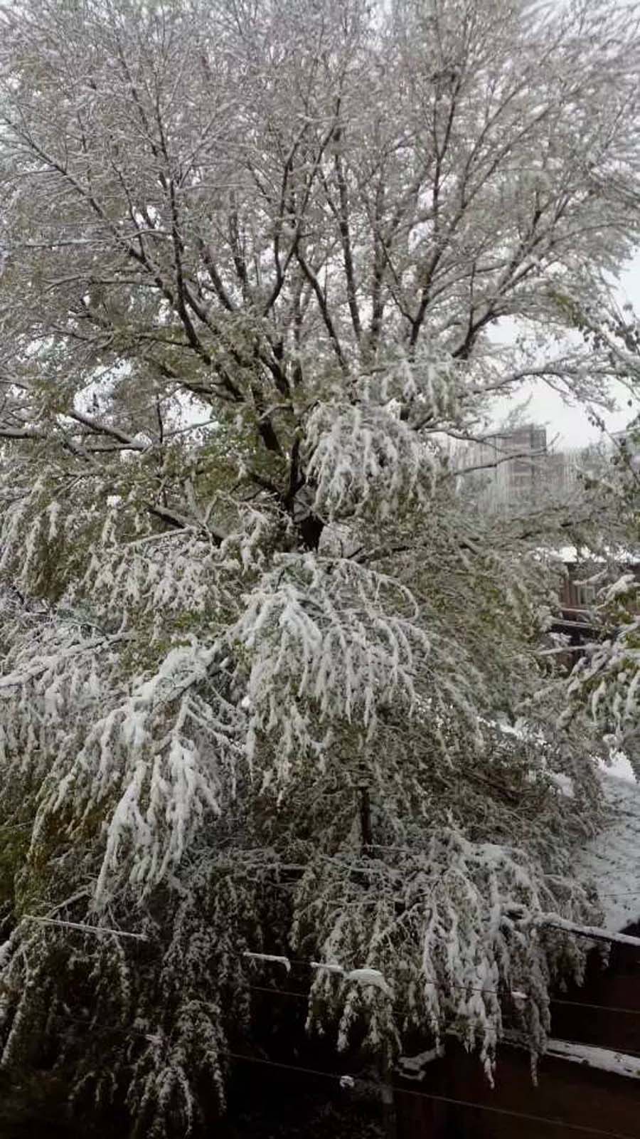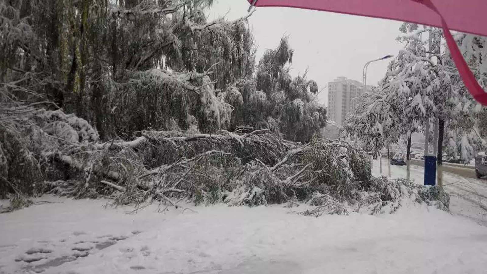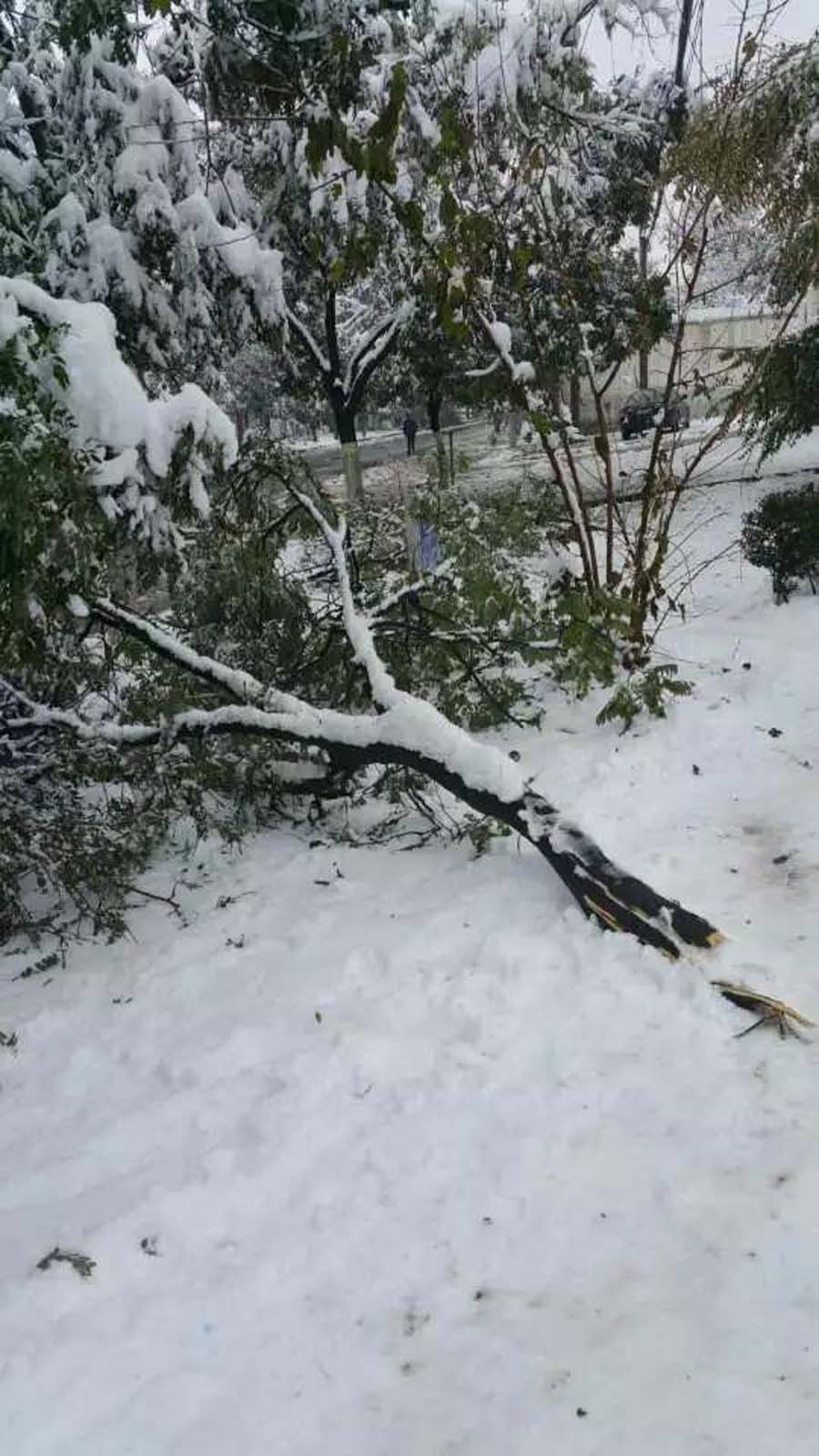 再看那些低矮的小树,头都低垂着,树身也被压弯了。路面上有好多环卫工人在打树上的雪,都是担心树被压断。那边电线也被压断了,全小区都停了电和水,人们的生活受到了极大的影响。