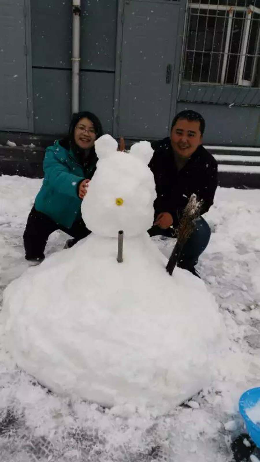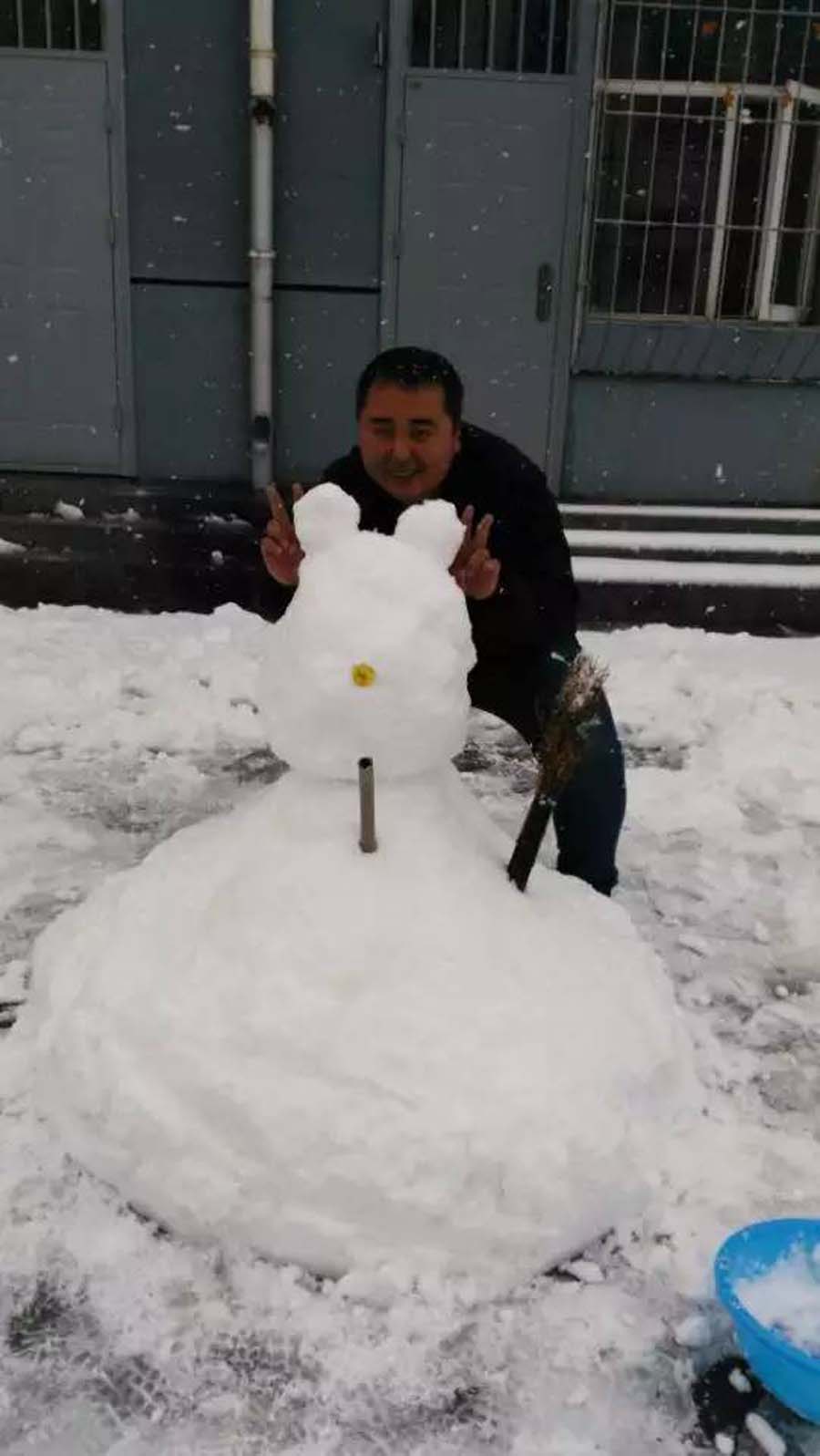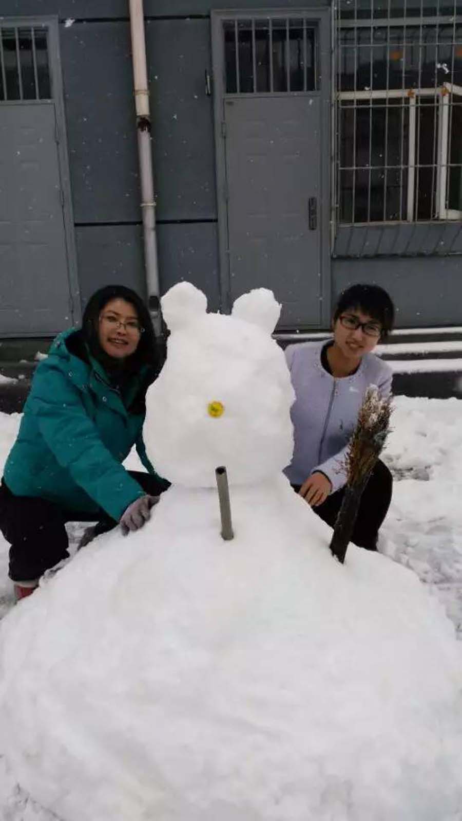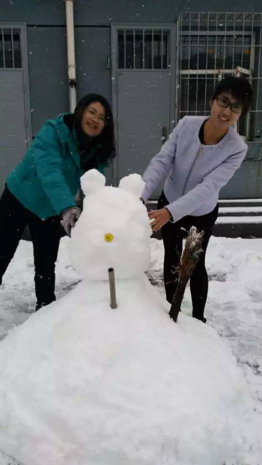 那边一组老师和学生合力在堆雪人,这样的活动哪能少了我。我飞奔过去,和老师们一起堆雪人。雪太厚了,根本不用去别处滚雪球,就在当地堆起来就行。不一会儿,一个硕大的肚子就呈现在我们面前。