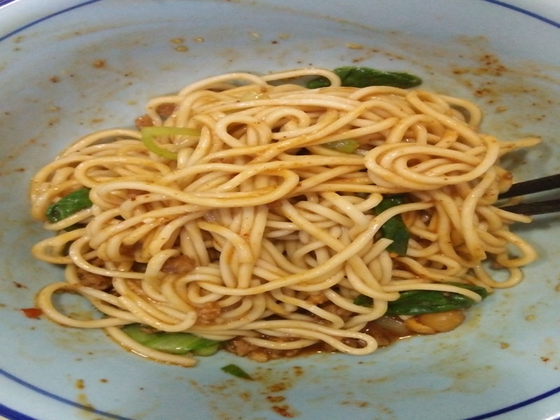 当一碗热气腾腾的炸酱面放在我面前时,首先我便会倒上一大勺辣椒,这样才有味嘛!因为我比较喜欢吃辣,接下来我拿起筷子拌均匀,面拌满了炸酱,辣椒,调料,黄黄的,别具特色,香味一直在我鼻尖围绕着,让我迫不及待的挑起一块面放入嘴中吃了后特别美味,又有嚼劲,又好吃,辣辣的再加上有泡菜就更美味了。