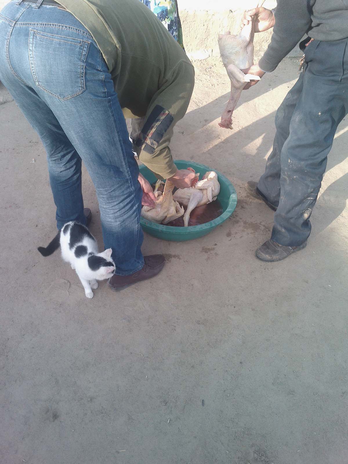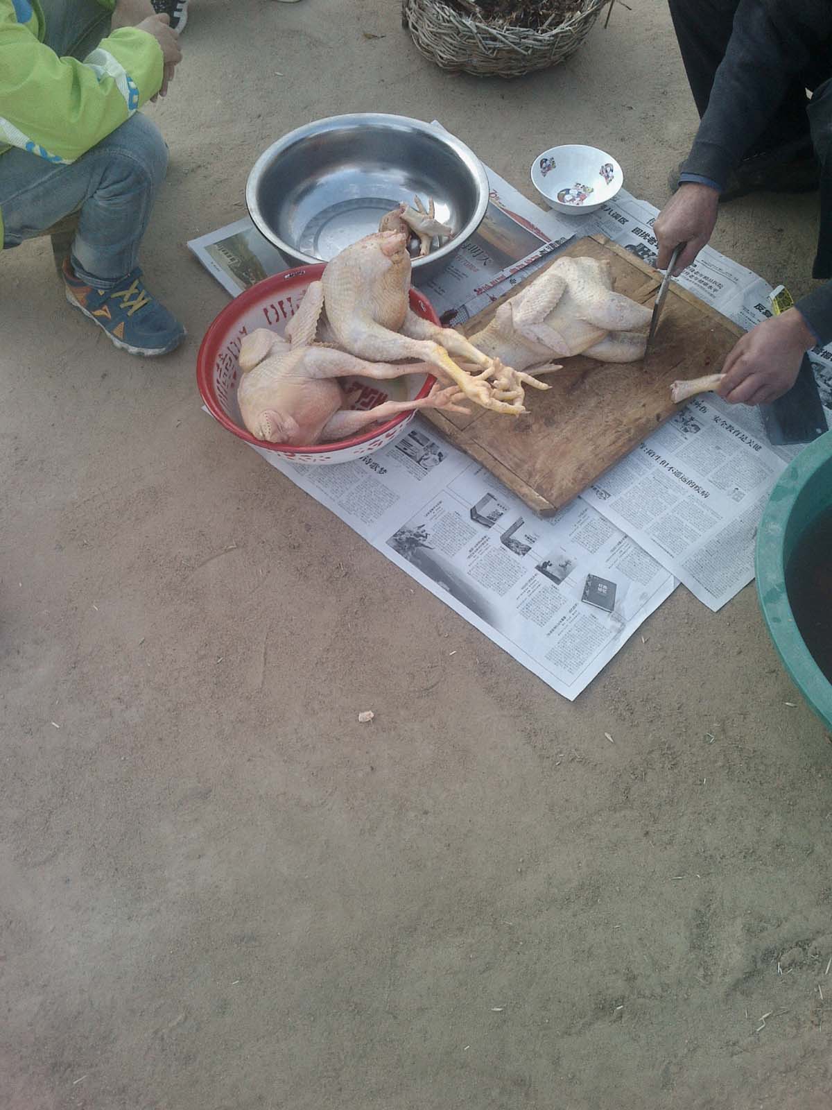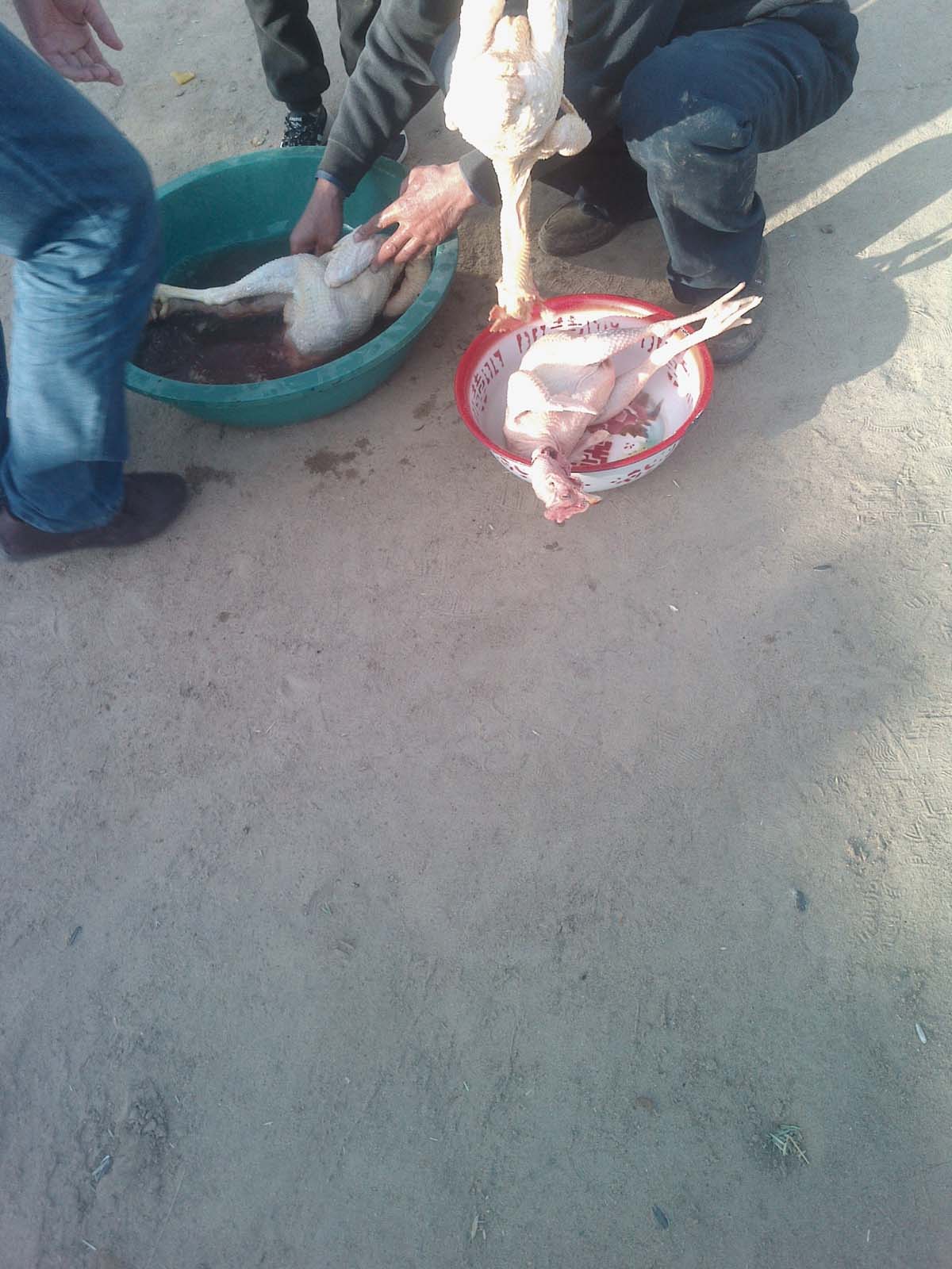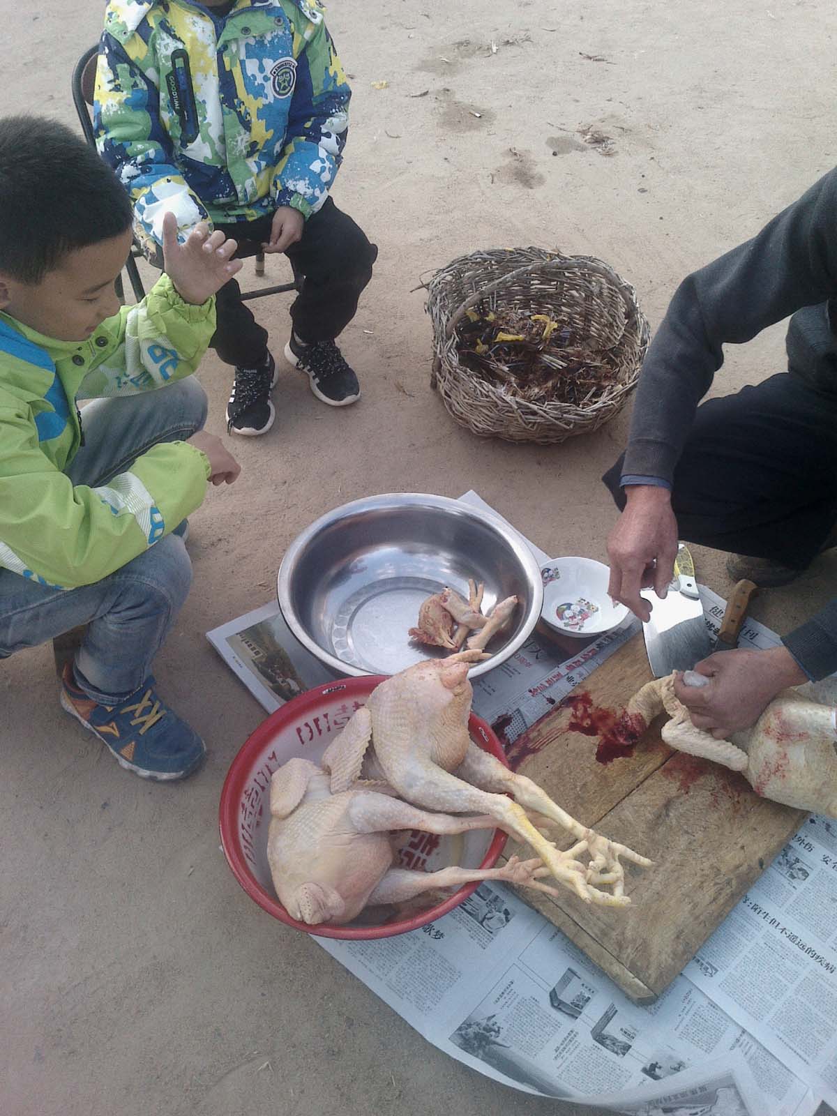 过了一会儿,姥爷喊爸爸杀鸡。那三只可爱的公鸡一会儿就没了气,躺在开水盆子里被拨毛。我突然有一种恻隐之心,我们是不是很残忍啊。为什么要杀鸡呢,它多可怜啊。我躲在一边去伤心了。