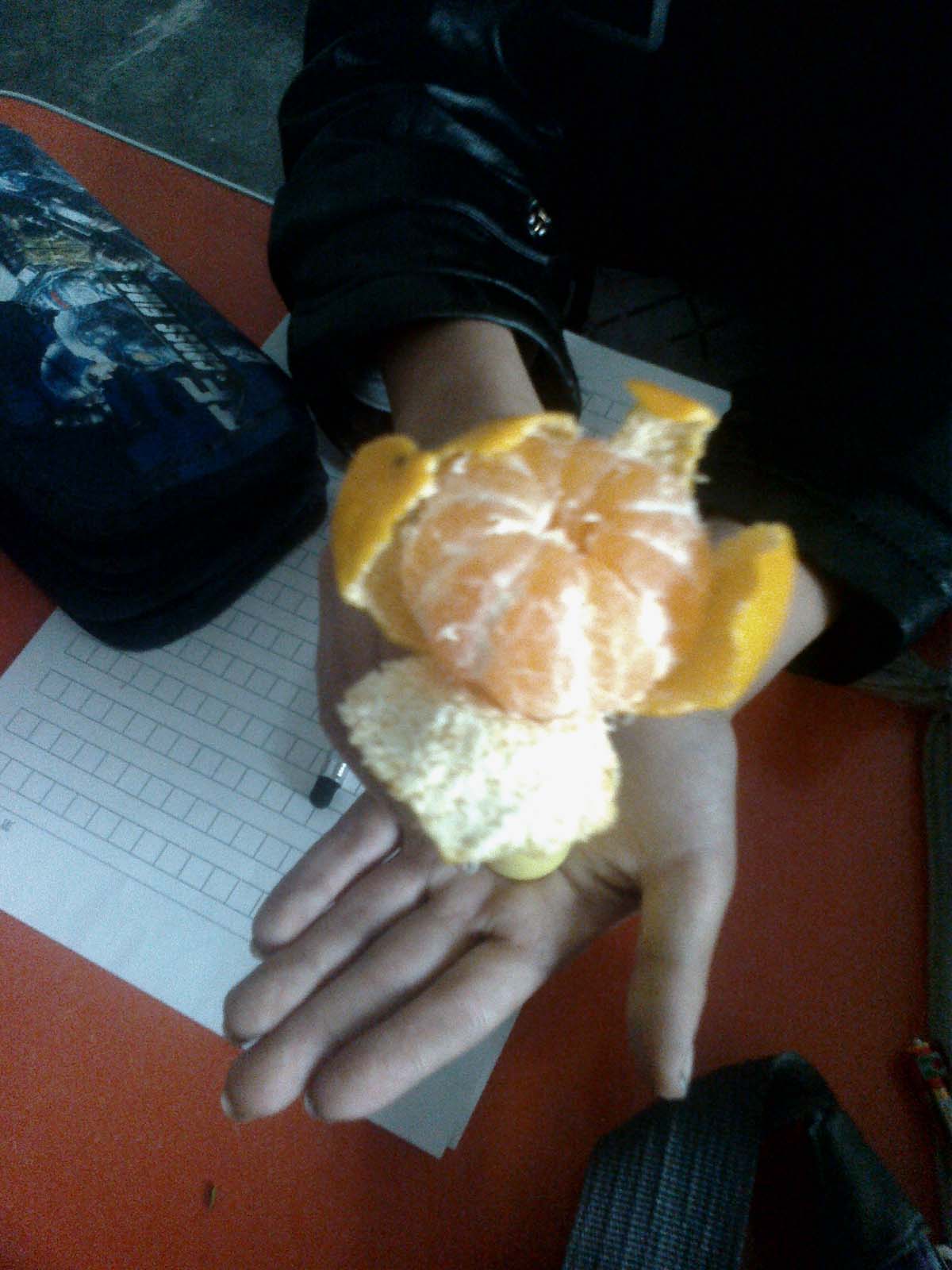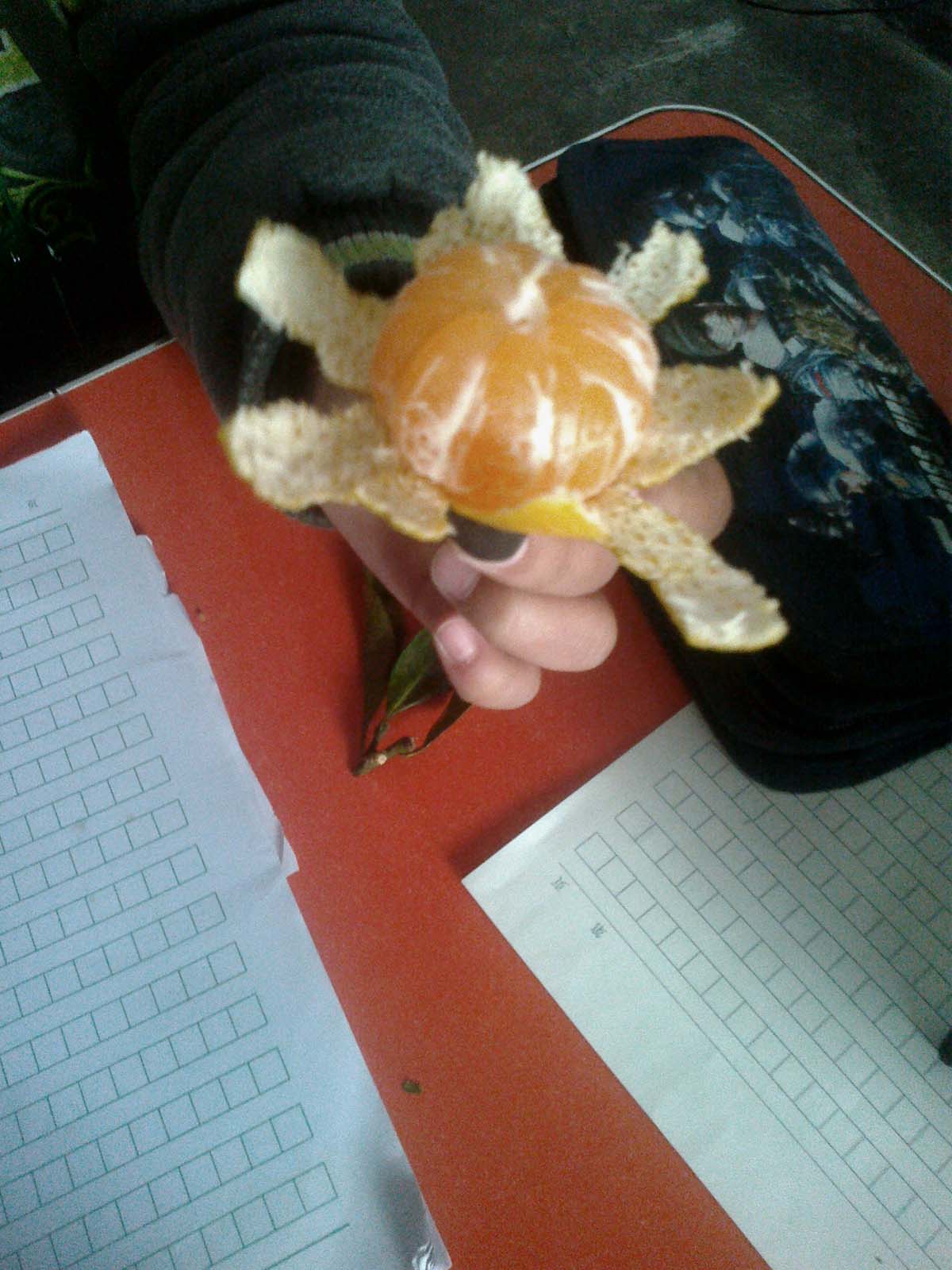 我先开始观察桔子,金黄色的桔子上长着两片嫩绿的小叶子,样子很可爱。按老师的要求,我们小心翼翼地把桔子剥开。如果皮剥不完整会被罚的,我们各自剥完了自己的桔子。然后进行下一项内容,就争桔子,老师让我们写关于水果的成语,谁写的多还能多得一个桔子。有的同学写了四个,有的同学一个也没写出来。写四个是最多的,他们都得到了一个桔子。