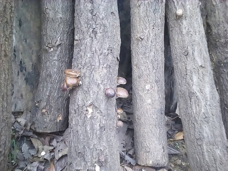 我们家的香菇是用菌棒培育的。人们是在挑选好的木棒上钉上一个个小孔,再把多余的木头屑打成锯末,把锯末和营养液混合在一起后再塞入小孔,最后将定下来的木塞塞进小孔中。就这样有了水分后,菌种便会在小孔中慢慢生长,就长成了我们食用的香菇。
