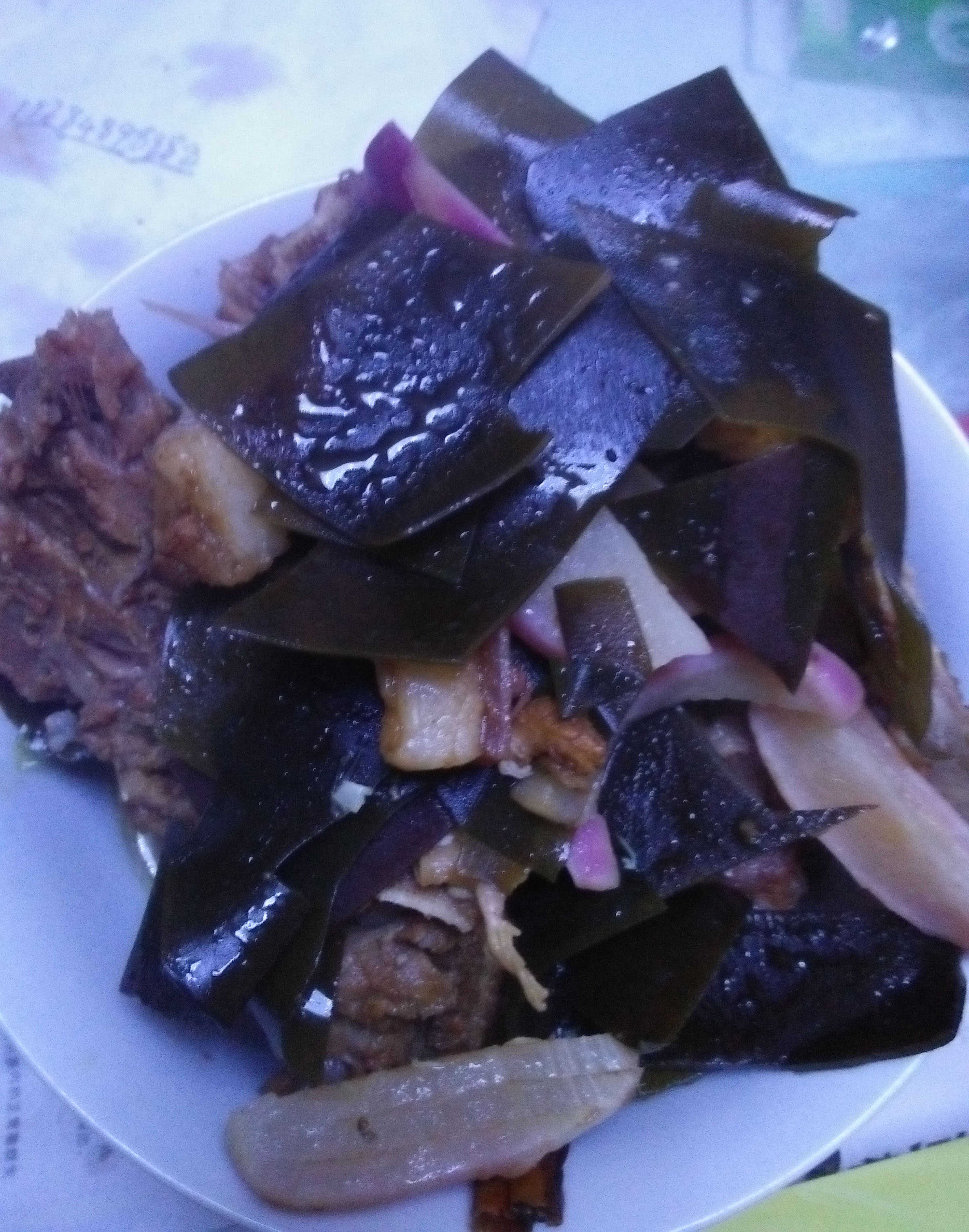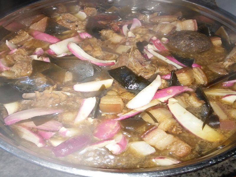 第四步:加入五花肉、海带煮到快熟时就放一点已经萎了的萝布夹,使它看起来更有食欲。