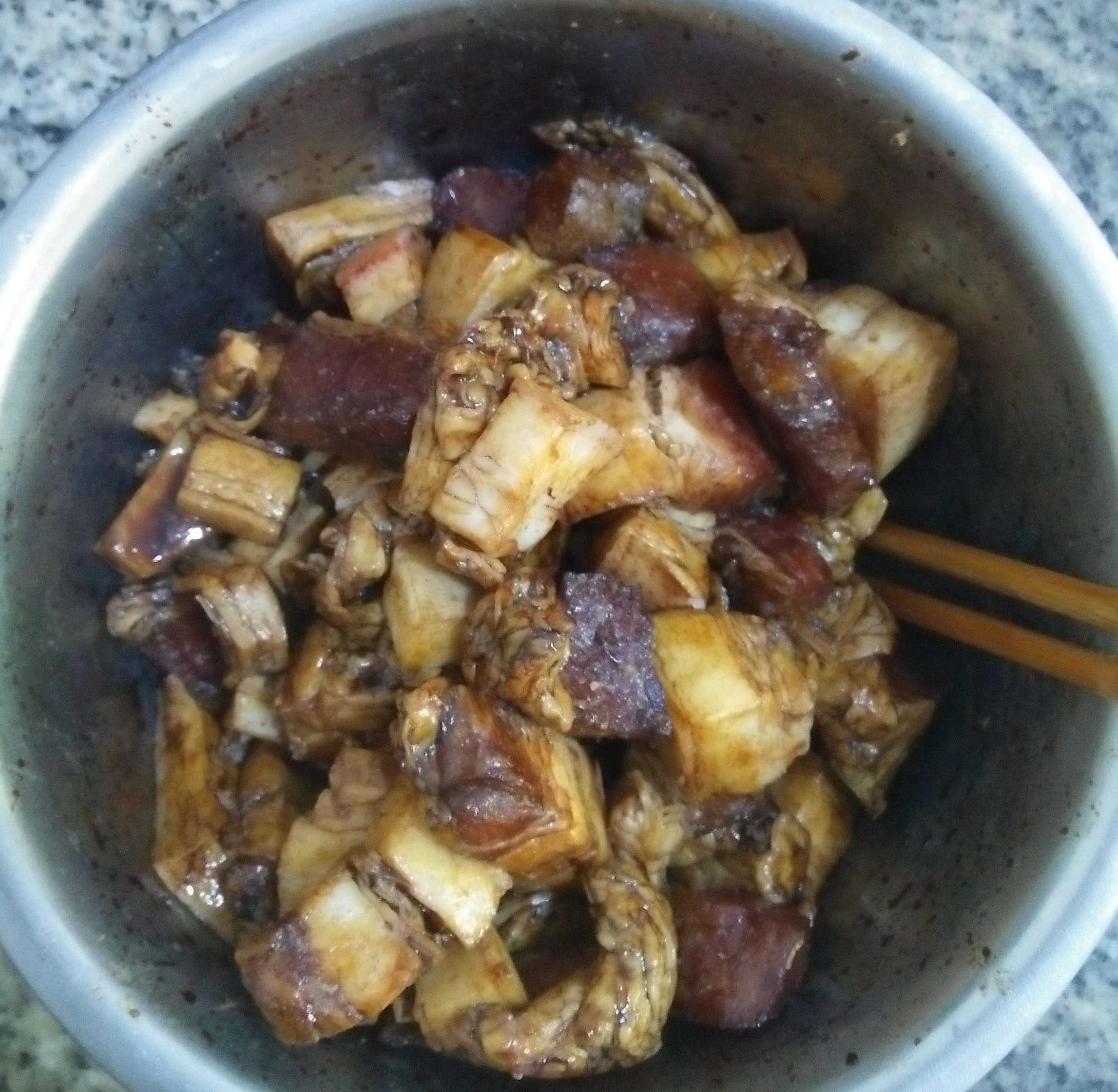 第二步:将五花肉切成片,在切条最后切成等同大小的丁,再加入盐、椒面、酱油搅拌均匀进行调味和调色,使色泽更加鲜美。