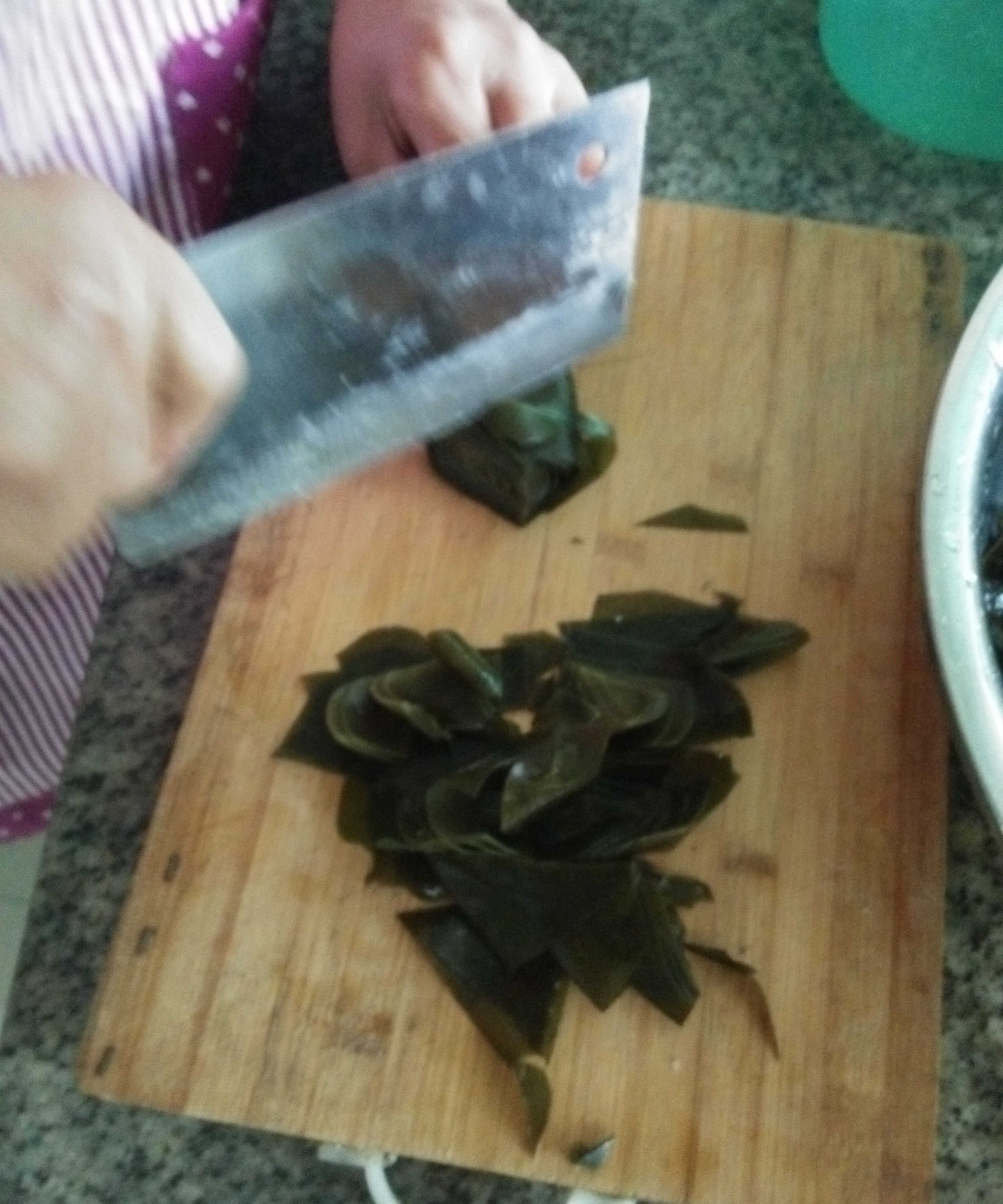 第三步:洗几匹海带从头卷到尾,从侧面切左切一刀,右切一刀,这样海带会变成三角行,也方便夹。待切完后放入盆中加一小勺的盐搅拌会使海带煮的时间缩小。