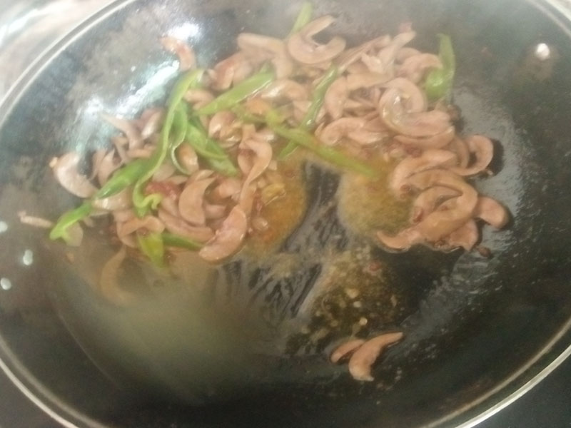 再放入腰子在锅中爆炒,吵得要输的时候放一些辣椒进去。炒一会就可以起锅了。