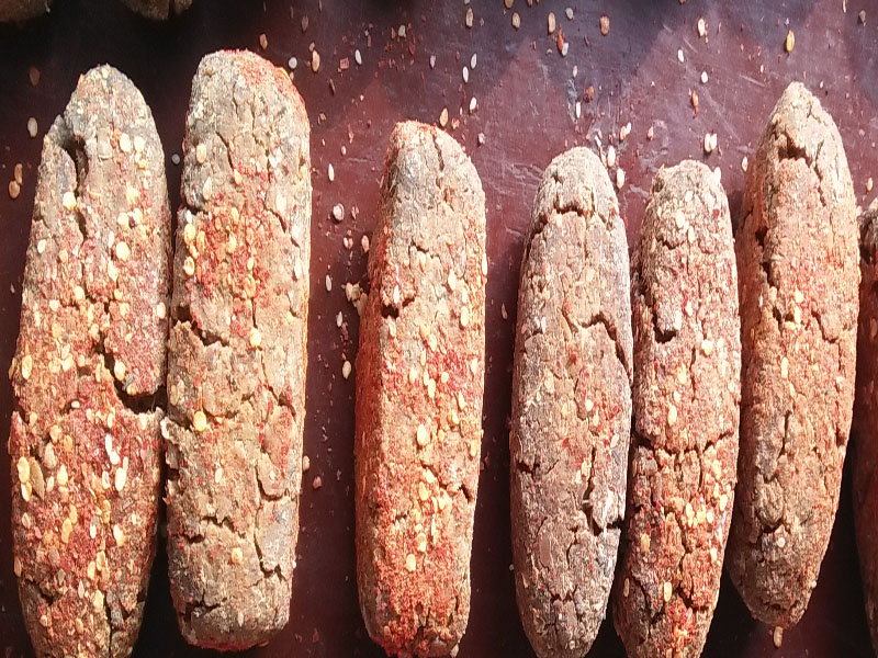 先把她捏成圆的再把它桌子上打成方的或者是长的。让它吹两天后就给它在外面裹上一层辣椒面,再用谷草编成像藕一样的一节节形状挂在那里让风把它吹干,