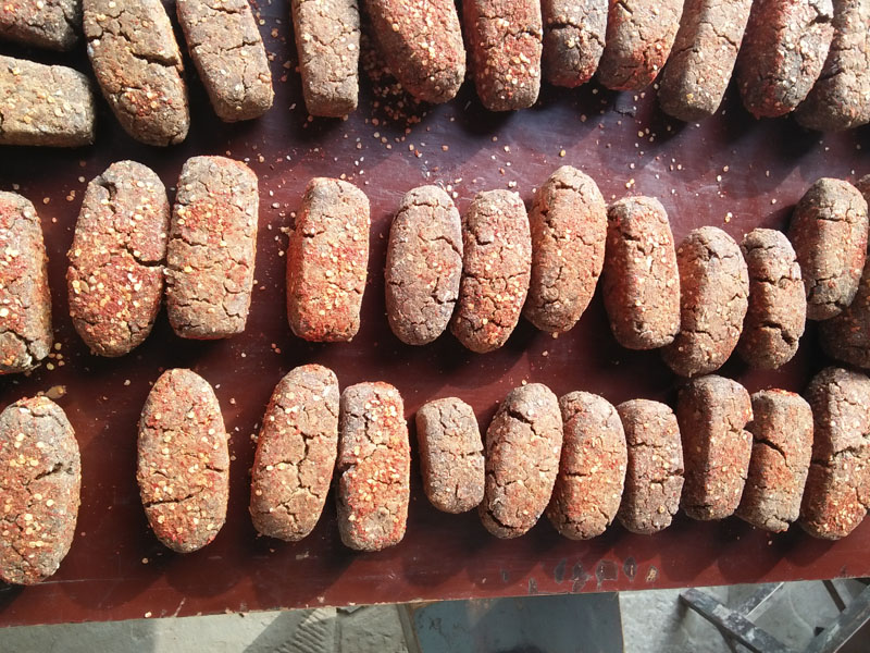 半个月后,发的有豆食味道的时候,就拿出来放到菜板上用刀砍,再切个姜、大蒜、椒面、辣椒面等调料后就可以开始做了。