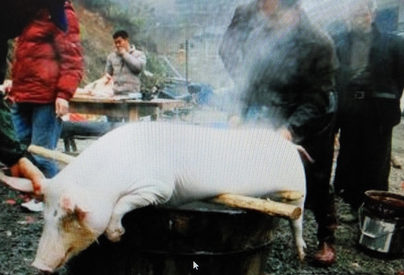 舅舅把猪抬到烧滚的水里,这时,猪皮被烫酥了,舅舅便找老了一些奇怪的石头,开始在猪的身上打。不一会儿,猪好像洗了一个澡一样,白胖白胖的,现在要宰猪啦,只见舅舅一刀下,猪头被砍掉了,手起刀落,猪成了两半,我们把猪挂在横杆上,只见舅舅均匀的剁猪肉,猪被剁成一大块大块的。这个舅舅从头到尾用着熟练的干着,他具备着力气,速度,技术,我真的非常佩服他,这真叫熟能成巧。舅舅用他们熟练的技术让猪征服,这真是熟能生巧。