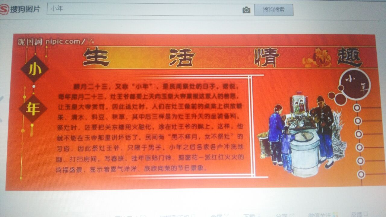 小年的习俗是置办年货和打扫屋子 相传,腊月二十三或者是二十四这天,是灶王爷升天的日子。这灶王爷之所以要升天,就是要去天宫里向玉皇大帝"述职",禀报自己这一年来掌管人间烟火的工作情况。灶王爷要升天,这当然不是一件小事。弄好了,灶王爷在玉皇大帝面前多给美言几句,来年就能风调雨顺了。反过来,灶王爷不说好话,玉皇大帝一生气,收成不好,那就苦了。所以,人们都要来"祭灶"。祭灶要吃麻糖、喝酒。那为啥要用这两样东西呢?原来,人们是希望用酒把灶王爷喝得晕头转向,最好连北都找不着才好。而吃甜甜的麻糖,是因为这种糖吃起来粘牙。灶王爷喝多了酒自然跟玉皇大帝汇报工作时就说不到个点子上了,再加上吃了人家的糖,说起话来就甜了,只能说好话。即便是不想说好话,这麻糖粘在牙上也说不出多少坏话来。嘻嘻!"只鸡胶牙糖,典衣供瓣香。家中无长物,岂独少黄羊。"