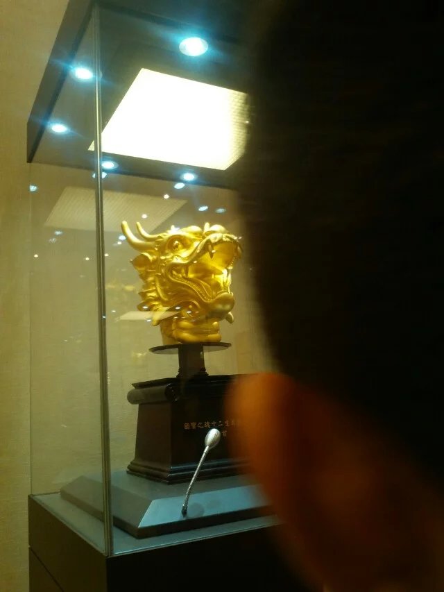 这里有黄金制作的十二生肖兽首,看,这个龙首高傲的昂起它的头颅,张开嘴似乎在呼喊着什么。那两只如鹿的角向后背着,目光炯炯有神,那眼里有一丝凶光,似乎在看着什么。我神游其中,它的眼睛看着我,恰好,我也在注视着他。真是“相看两不厌,吾与金龙首”