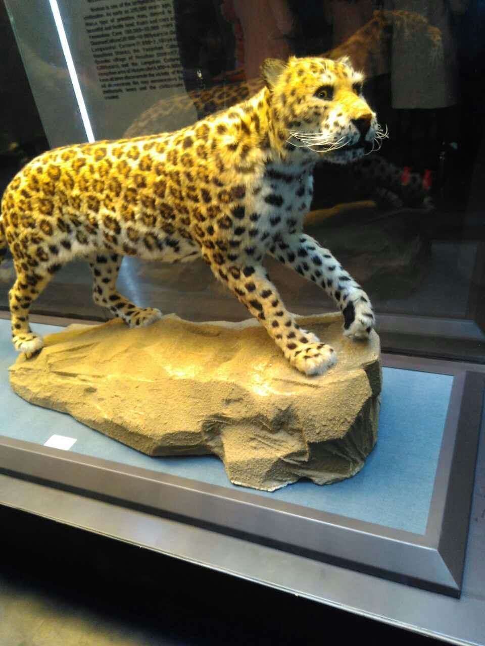 还有这只满是斑纹的豹子,它是由蜡塑成的。它站在一块石头上,前爪弯曲,后脚直直的站着。眼睛注视着前方,眼光犀利却又不缺乏成熟。看它的样子,像是在凝视远方,却又像是在蛰伏着,准备猎取那美味的大餐。他的形象栩栩如生,匠师雕刻的技艺真的算作巧夺天工!