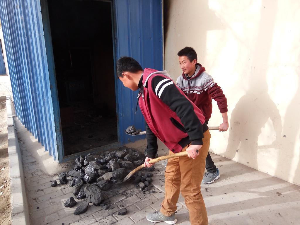 最后的工序是下一组的同学把煤搬进锅炉房。这两个同学也蛮拼的,用铁锹一锹一锹地运送。虽然是一次小小的劳动,但同学们都热情高涨,没有一个偷懒的,看样子我们的团队是一个有竞争力的团队!