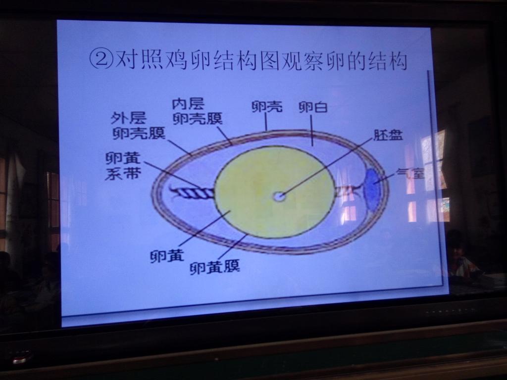 李老师让我们对照鸡卵的结构图观察鸡蛋的结构。通过观察,我们了解到了鸡蛋的构成。鸡蛋是由蛋壳 、蛋壳膜、气室、蛋白、气室、系带、胚盘等组成的。