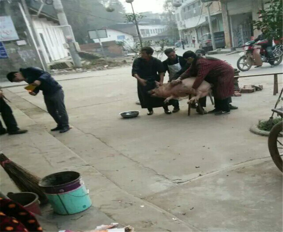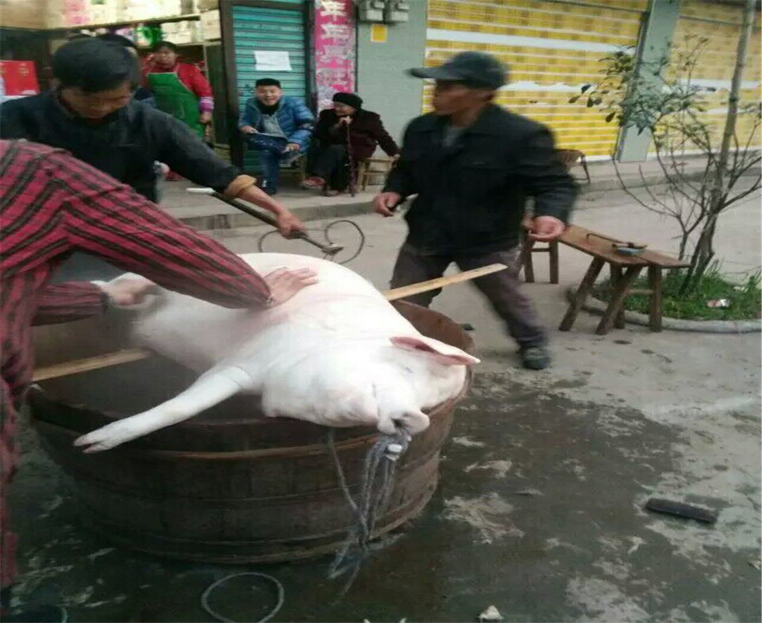 杀年猪得请人来杀,杀猪是有讲究的,都是杀猪匠和有福气的人,请这样的人杀猪是希望猪肉能沾上一点儿杀猪人的福气。 杀猪得讲究快。杀猪人让五六个壮汉帮忙,分别按住猪的头和四肢,以免猪挣开束缚逃走。然后由杀猪人将早已磨好的锋利的杀猪刀拿起,刹那间刺入猪的咽喉,将猪的大动脉切开。只见猪最后无力地挣扎了几下,咽喉处血喷不止。这儿的血喷是相当有讲究的,血喷的多,猪的主人就越欢喜,觉得今年的兆头好;血喷的少,猪的主人就会不高兴,认为今年不是一个福年,并且不会再请这个杀猪人了,因为他们认为这个杀猪人的技艺不够高超。猪血不会随便地乱流,而是接到一个专门用来装血的桶中,准备以后做成猪血(猪血是将猪的血液和油盐放在一起,待凝结后,用小火蒸出的美食)。