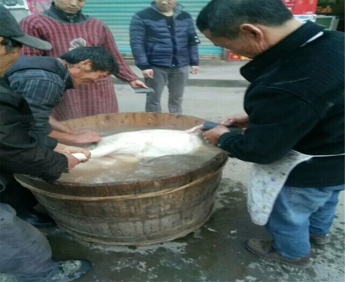 做完这些,就该给猪褪毛啦。杀猪人将根据天气和温度来烧出温度适宜的水来,这是因为褪毛的好坏就在于水的温度掌握的好不好。好的话,猪毛就能褪得一干二净;如果不好的话,猪皮上就会留猪毛,让人食欲大减。然后将这些温度适宜的水倒满一个能放进整头猪的桶中。由于猪的个头很大,我们那儿的褪毛桶都是特大号的,几乎可以让两个成年人洗澡。将猪放入桶中后,杀猪人拿着卷刀,用刀刃在猪皮上来回摩擦,直至猪毛基本消失。再将刀放下,用肉眼仔细寻找漏网之鱼,发现既用手将毛拔出,这可是一个细心活。