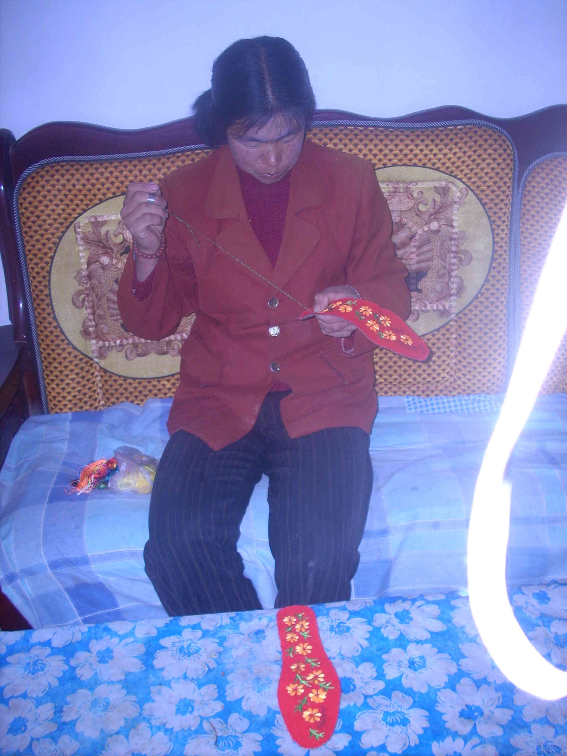 鞋垫的花样很多,有十字绣,也有刺绣,在大妈那双巧手下,一双双鞋垫显得特别有生气。跟大妈坐在一起聊了一会儿才知道,用来绣鞋的彩线有很多,而且,在颜色的搭配上也有很大的讲究。大妈不仅针线活做的好,而且她织的毛衣也不赖呢?