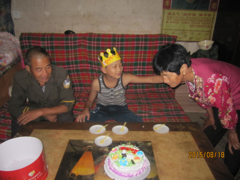 这时,我们打开了蛋糕,为弟弟插上蜡烛,许完愿后,就开始切蛋糕了,弟弟将中间的小羊切给了自己,给我们分别切了旁边的花,于是,便有了爷爷和弟弟的一张合照。