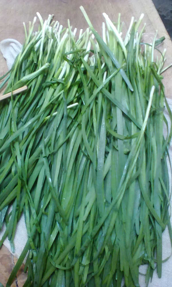 奶奶先把韭菜洗干净,然后把水控干,把韭菜切成很小的丁,在把肉切成小丁,把它们两个和在一起,这样肉馅就做好了。