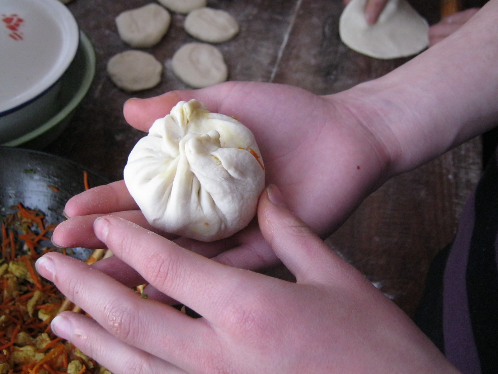 接下来把面和好了。然后把面团搓成长条形,分切成小圆粒。接着,把这些小圆粒捏成圆形薄皮,放着备用。