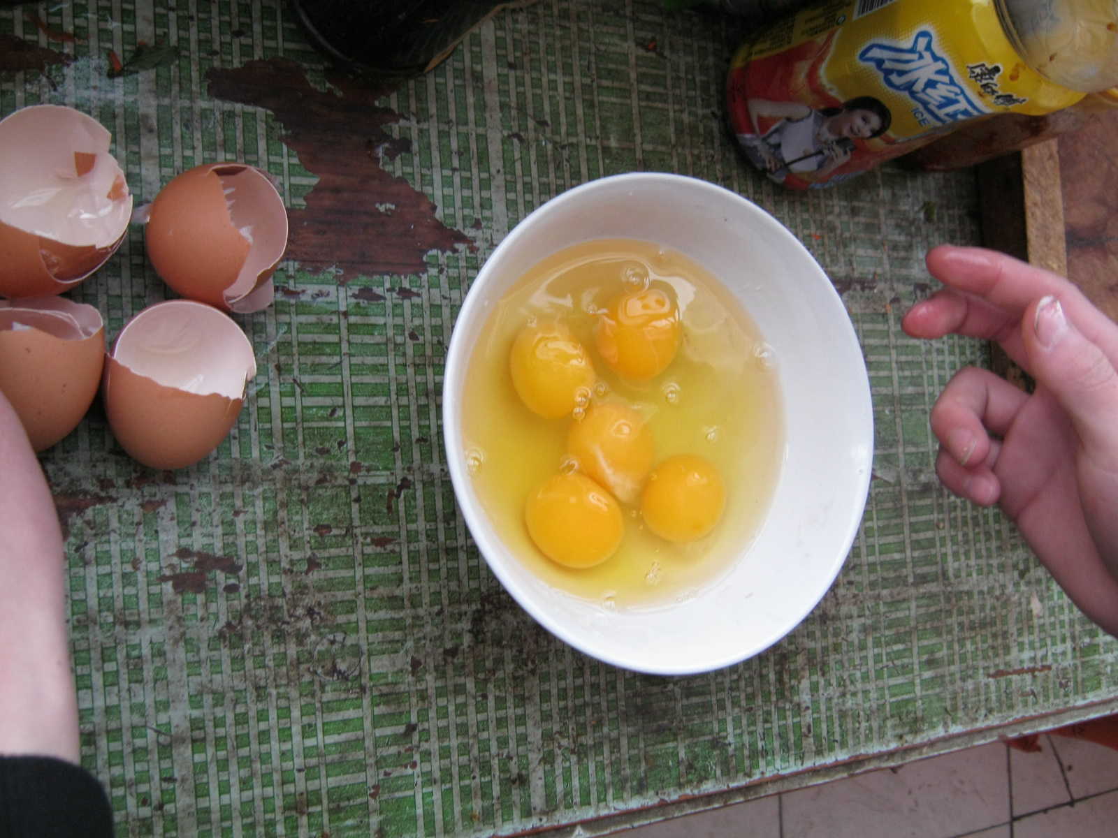 接下来的工作就是处理鸡蛋了。按照吃饭人定量,每人一个鸡蛋的量,把鸡蛋磕到碗里,加一点盐,用筷子使劲搅打,把蛋液混合均匀。