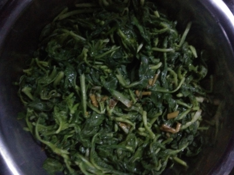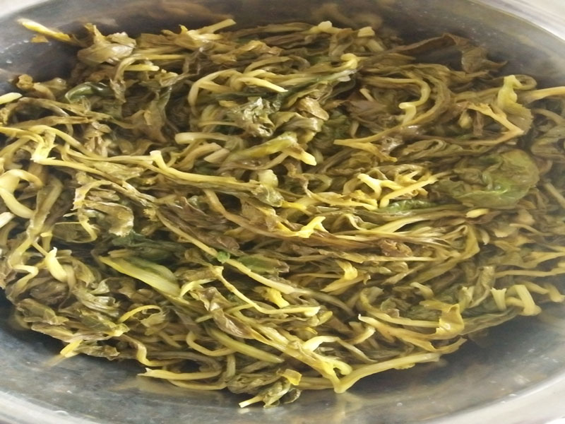 等水热了后,就把菜放进锅里过水,等到菜叶变色就捞起来,滤一下水,等菜的热气散的差不多的时候,就把酸水倒进去再盖上盖子。