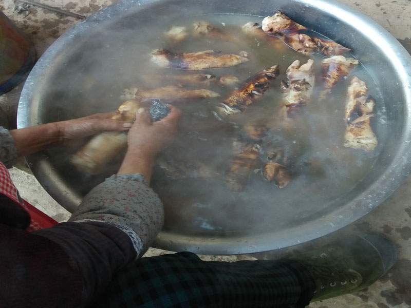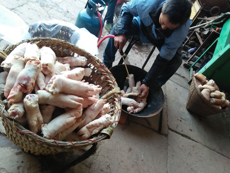 等厨师把猪蹄烧好了,就放在准备好的热水盆里,让帮忙的人用铁抹子把猪蹄烧黑的地方洗干净,放在桶里。