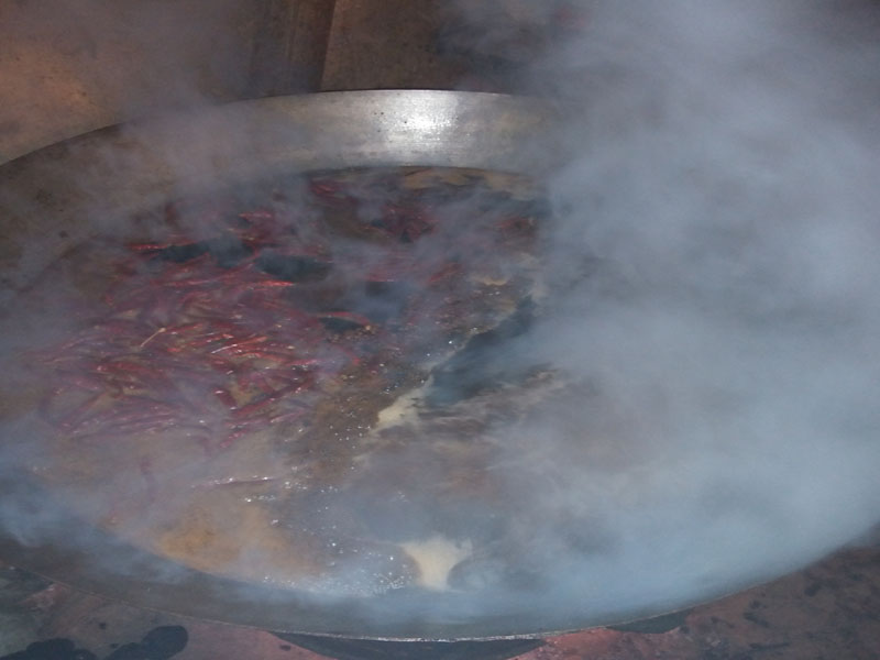 下一步,等有两筲箕的时候就导入提起那准备好的料锅中,直到猪蹄变色就可以了。酱料有辣椒、姜、蒜、花椒……等调料配置的汤料。