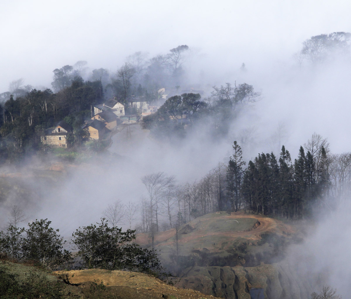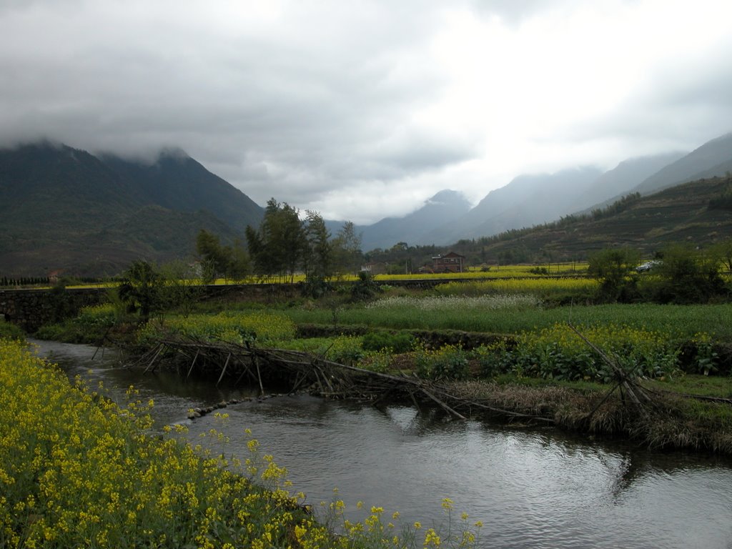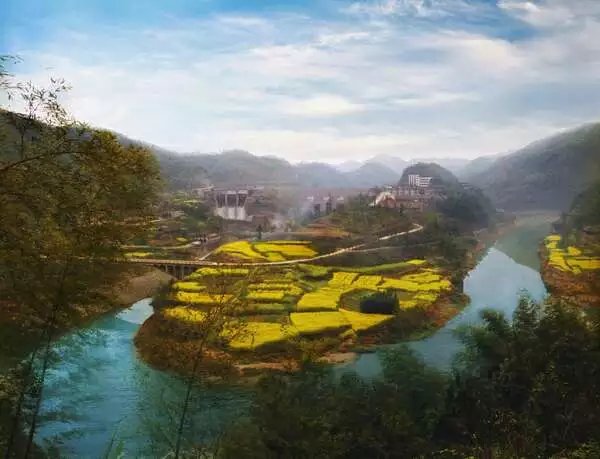 尽管天空如何沉重,压的人如何窒息,这里的春天依然焕发着无限活力,鲜花漫山遍野,光彩绚丽,牛马羊群精神饱满,完美的诠释了大自然的姿态,整一副美丽的山水画,人们的魂被烙印在了这画卷之中,散不开来。整个山在这压抑之下仍然热闹非凡,人与人熟络的如同一家人,谈天说地,漫天大雾挡得住人的双眼,却挡不住这里的人文风情,挡不住人们热情好客的纯朴的心。这正是我梦中的景象:"往来种作,男女衣着,悉如外人。黄发垂髫,并怡然自乐。
