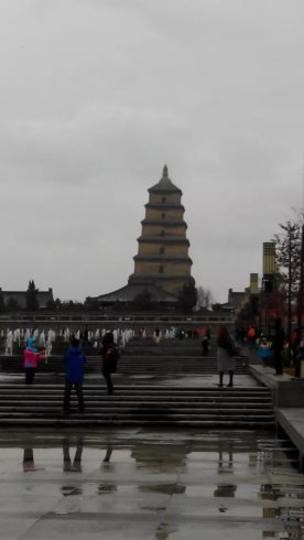 古塔,它就是自古以来就流传着“长安八景”之一的景点——大雁塔。大雁塔建于唐代,至今已有1000年的历史了。大雁塔高64米,有7层,底部是正方形的,下大上小。 大雁塔脚下种满了郁金香,红一片,黄一片……五颜六色,非常迷人。浓浓的香味,美丽的花朵衬托着这座雄伟的塔,使它格外引人注目,这时,人的疲倦便消失得无影无踪。 不远处,还有一片大雁塔广场,极大的面积,周围林立着唐风盛行的古楼建筑,中央有一片音乐喷泉,喷泉遇音调低则下降,高则上涨,景观非常优美,又不失壮阔。一条布满历史迁客骚人雕像和历朝历代史事碑林的直道,通向开元广场,这里充溢着武则天风华绰约的傲姿气质,透露出唐太宗挺拔威武的气势凌人。