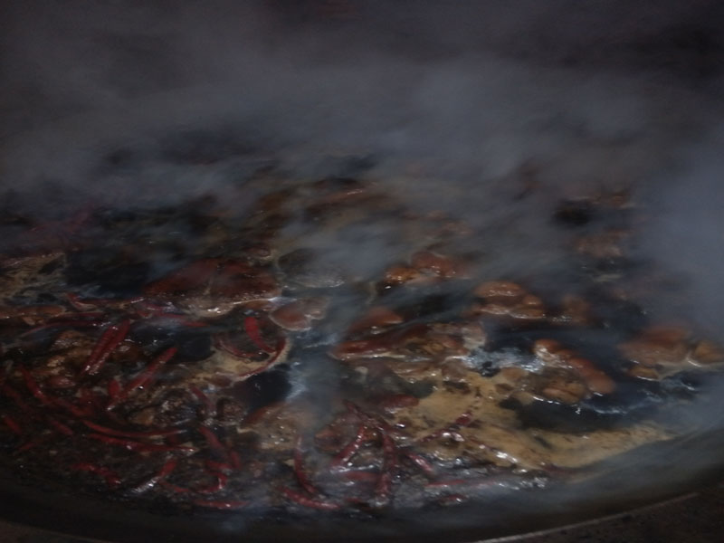 下一步,把切好的猪肘放进预先烧好的卤料锅中,让它的颜色入进肉里,味道更好。