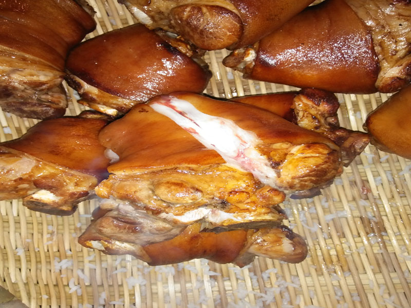 最后,等猪肘子卤好了就把猪肘子放到吸油纸里面再放点姜、青椒、辣椒等配料进去,在开席的时候,把猪肘在龙床里蒸个半小时,最后把吸油纸打开就可以端上席了。一道农村酒席上的特色菜就好了。
