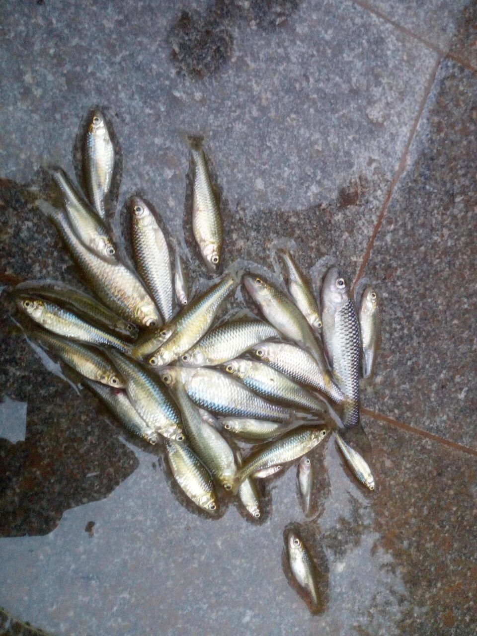 我听了,把鱼竿又甩了出去,目不转睛地盯着鱼竿,过了20分钟,我果然发现鱼竿有变化——下沉了。我赶紧拉,结果鱼竿被拉得很弯,像钩子。一条三寸的鲫鱼被我钓上来了,我顿时眉飞色舞,欢呼着,仿佛要把这个消息告诉全世界似的。我和姐姐从上午八点一直钓到晚上五点才回家。虽然时间挺晚,但是收获不小——一共钓了12条鱼,而且个个肥大。我和爸爸看着自己的“杰作”,开心地笑了。