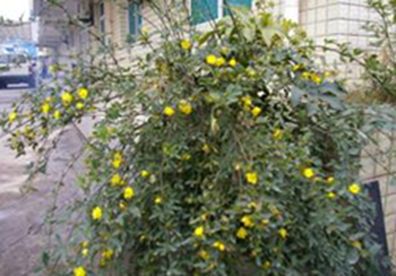 迎春花的枝条很有趣,它不像菊花、梅花那样生长,而是像吊兰那样向下倒垂着。金黄色的花瓣只有五六片,一朵绽开的迎春花花朵不过拇指那么大。花朵中央立着一根细细的雌蕊,仔细观察,还可以发现雌蕊头上有一小团绿色。