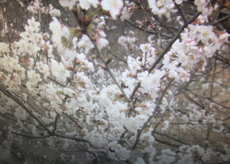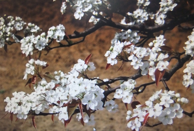樱桃树的主干非常粗,往上不高的地方就分权了。越往上枝干就越细。细枝上开满了一簇簇白色的小花。叶柄在花和枝头之间,它是草绿色的,靠近花的底部就变成玫瑰红了。樱桃花有五个花瓣,颜色雪白。它的雄蕊由十到十三根白色细丝组成,细丝顶端是一些黄色的花粉;中间还夹着一根绿色较粗的雌蕊。一簇花大约有六七朵,它们倒挂在枝头,非常漂亮。远远望去,好像是一位清纯的少女穿着洁白的衣服在翩翩起舞。近看,只觉得眼前一片雪白,好像身陷在一个白色的世界中。这些花儿,一簇堆在另一簇的上面,数都数不清。它的花瓣摸起来非常舒服,像擦了润肤霜的皮肤一样。