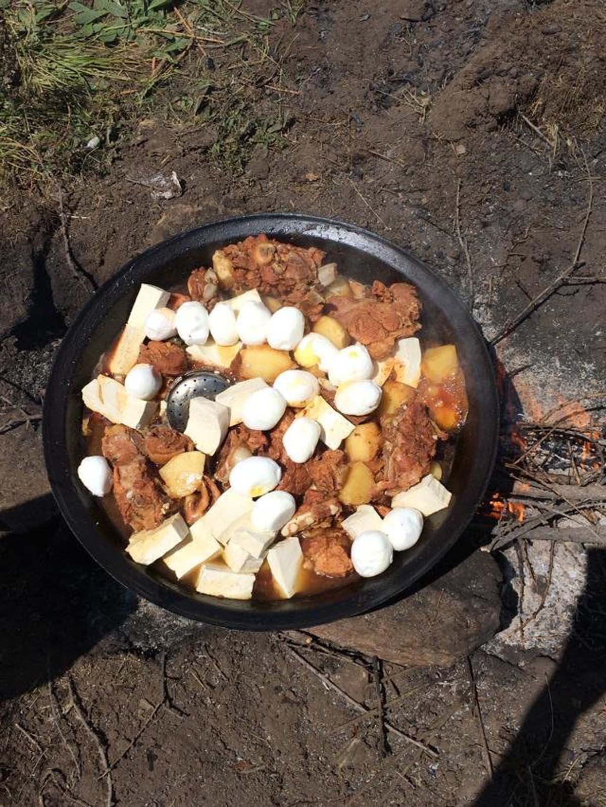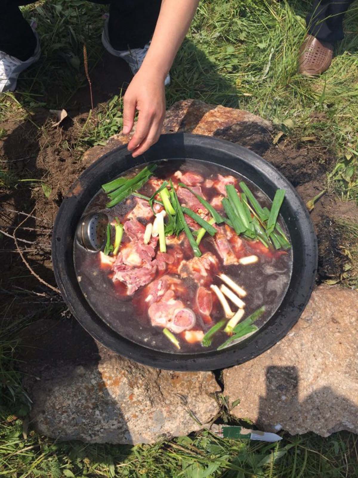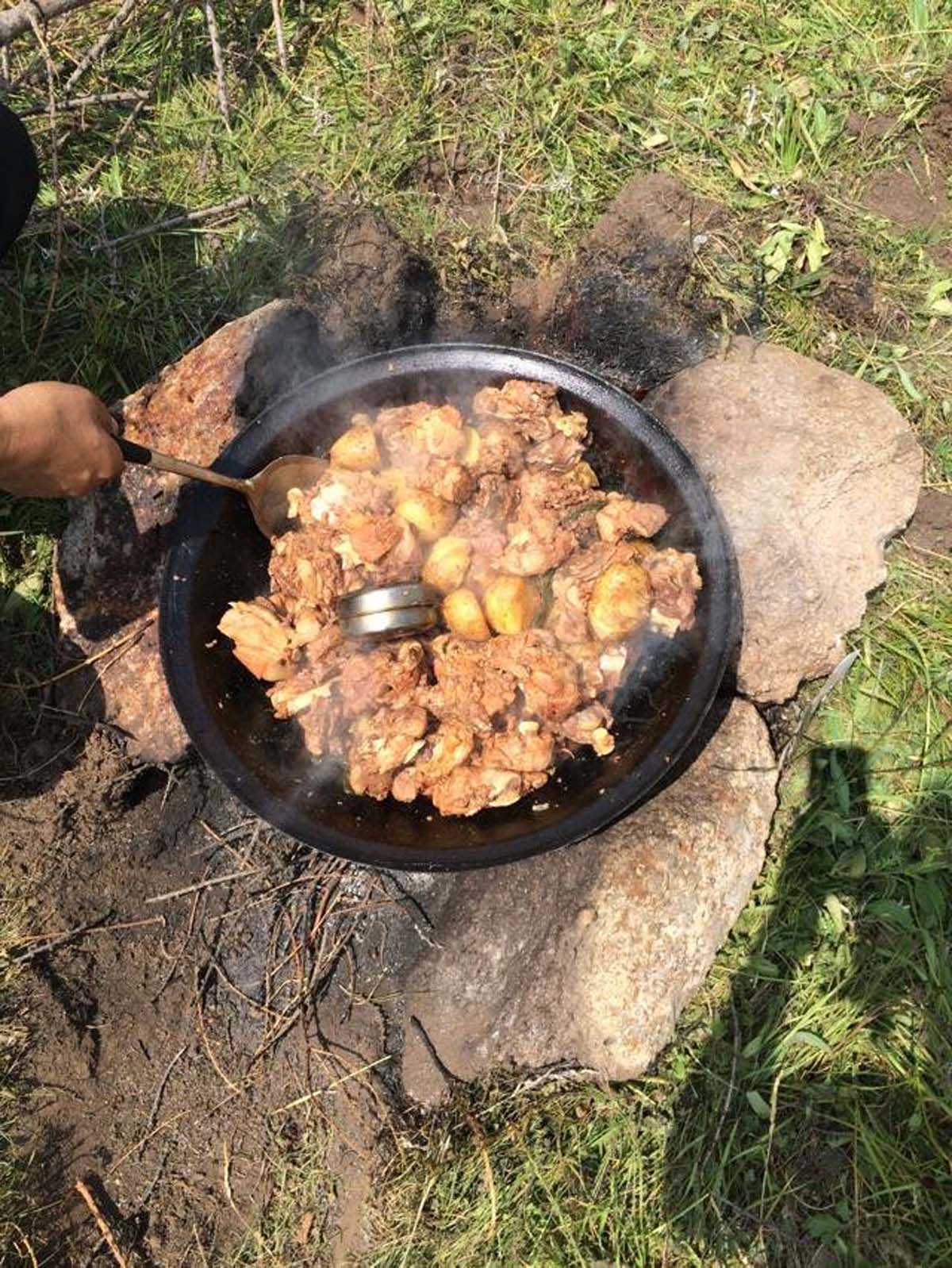 当我们拴回干树枝的时候,他们已经架好了锅。锅架在三块大石头上,铁锅里是满满的肉,还有鸡蛋和山药块。盖上锅盖,点燃干树枝,正式煮肉开始。还别说,没一会儿锅里就冒出了热气,再过一会儿,锅里就飘出了肉香。我饿得更厉害了。